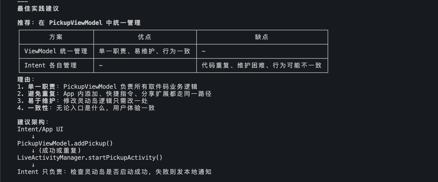 在主 App 的 ViewModel 中统一管理灵动岛的启用逻辑,addPickup() 方法现在统一处理 Live Activity 启动。