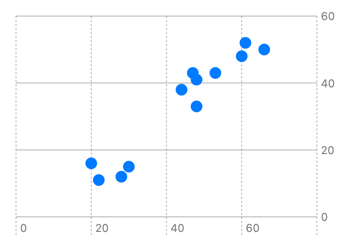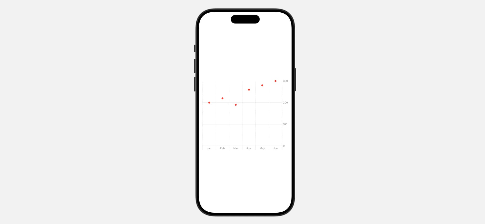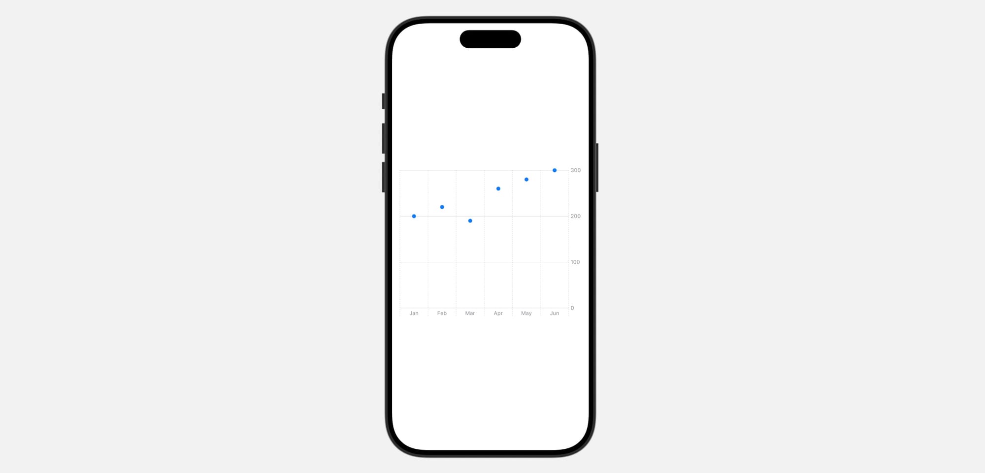 上面这个代码创建了如图所示的散点图。我们首先使用Chart 组件展示数据点。通过 ForEach 循环,遍历数据集 salesData,并将每一个数据点用 PointMark 进行展示。
