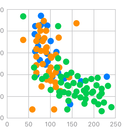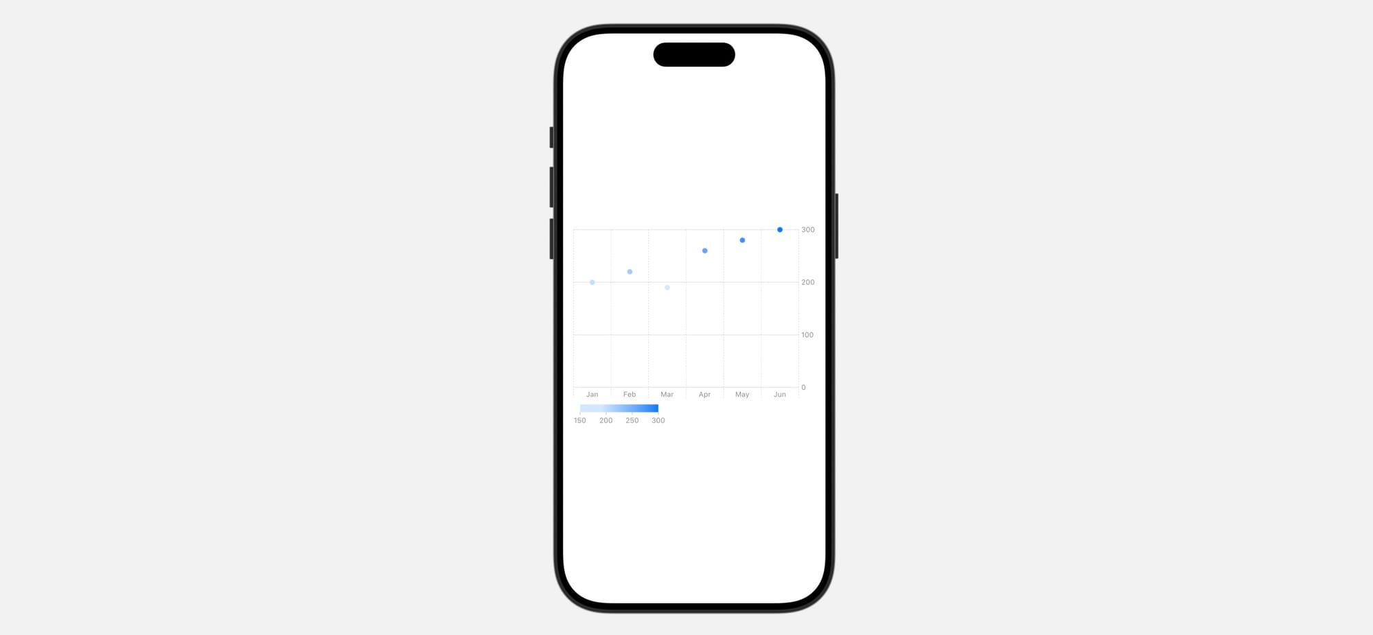 你无需手动设置具体的颜色,Swift Charts 会自动根据不同的值以及值的类型分配颜色。在上述代码中,由于 data.sales 是数字,因此 PointMark 自动选择使用渐变色来表示不同的值。
