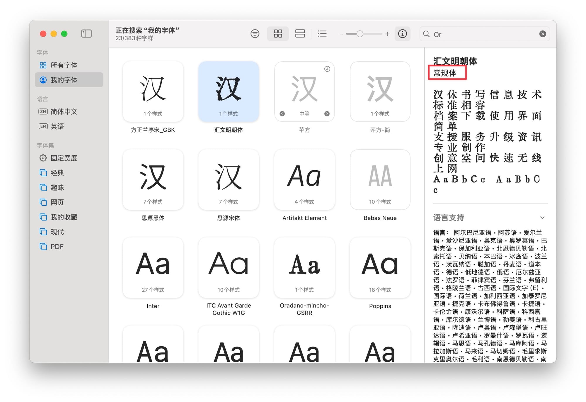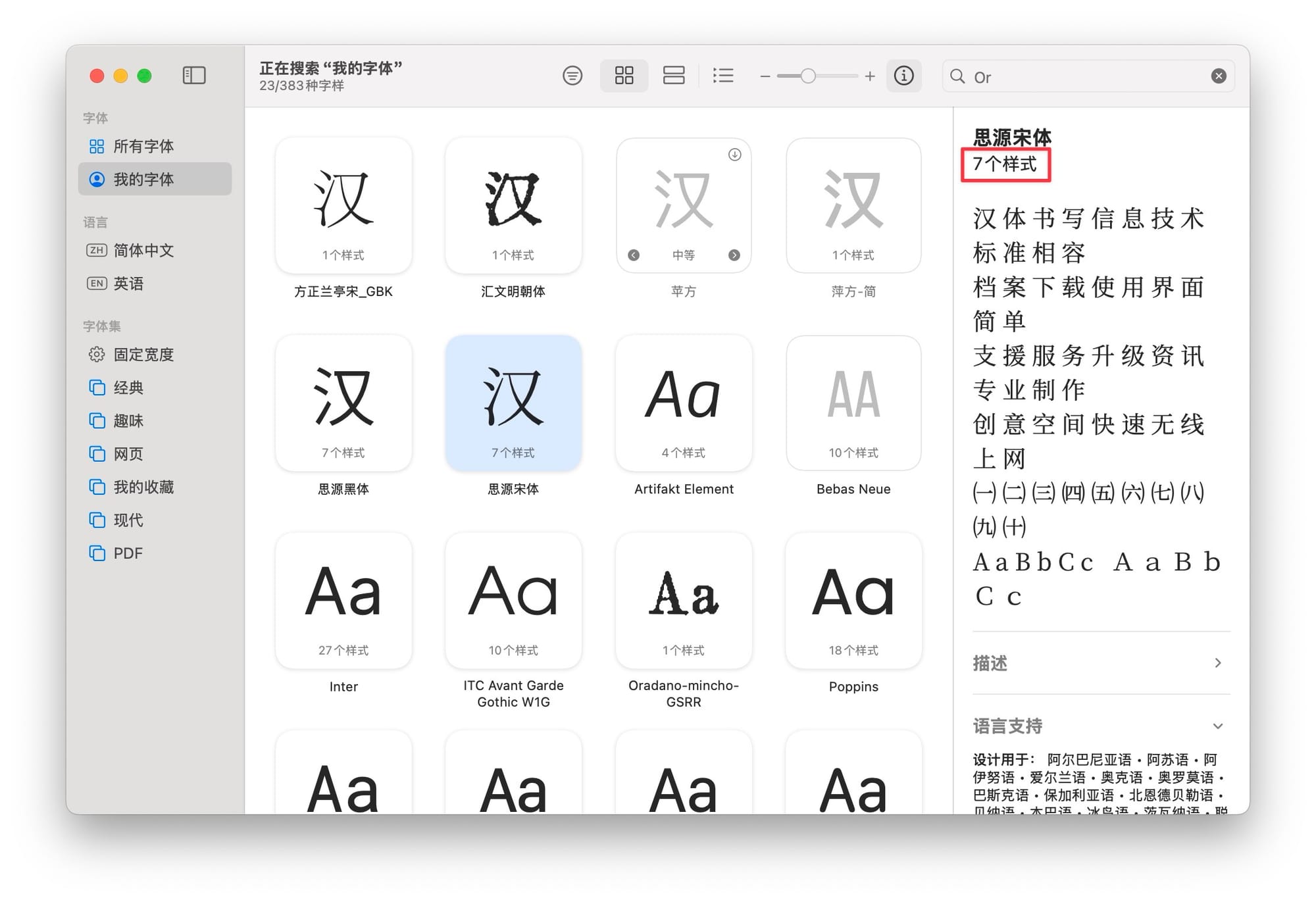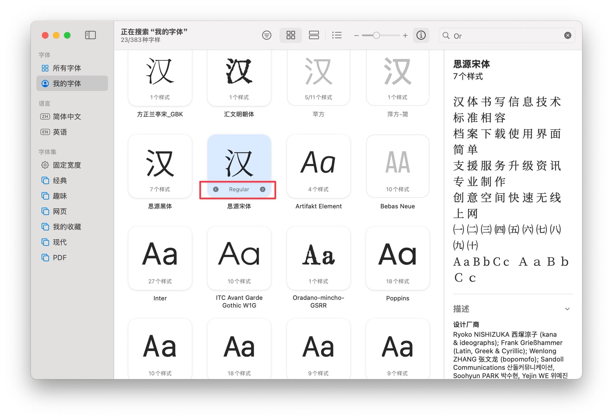 如果字体支持多个 Weight,字体册中会显示切换按钮: