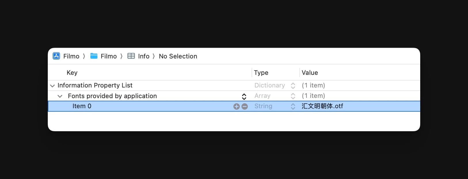 打开项目的 Info.plist 文件,添加一个名为 UIAppFonts 的键。