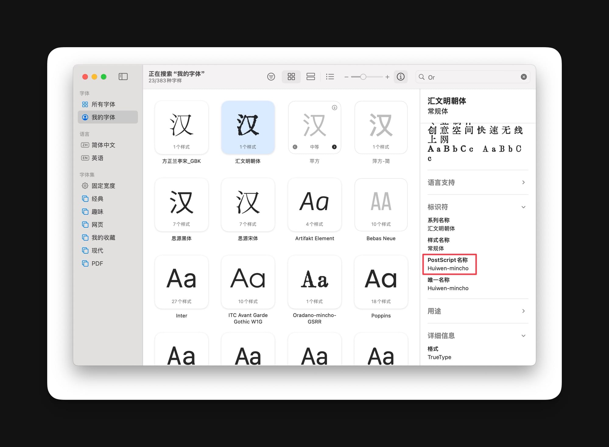 必须通过字体的 PostScript 名称来调用字体,你可以在「字体册」中查询: