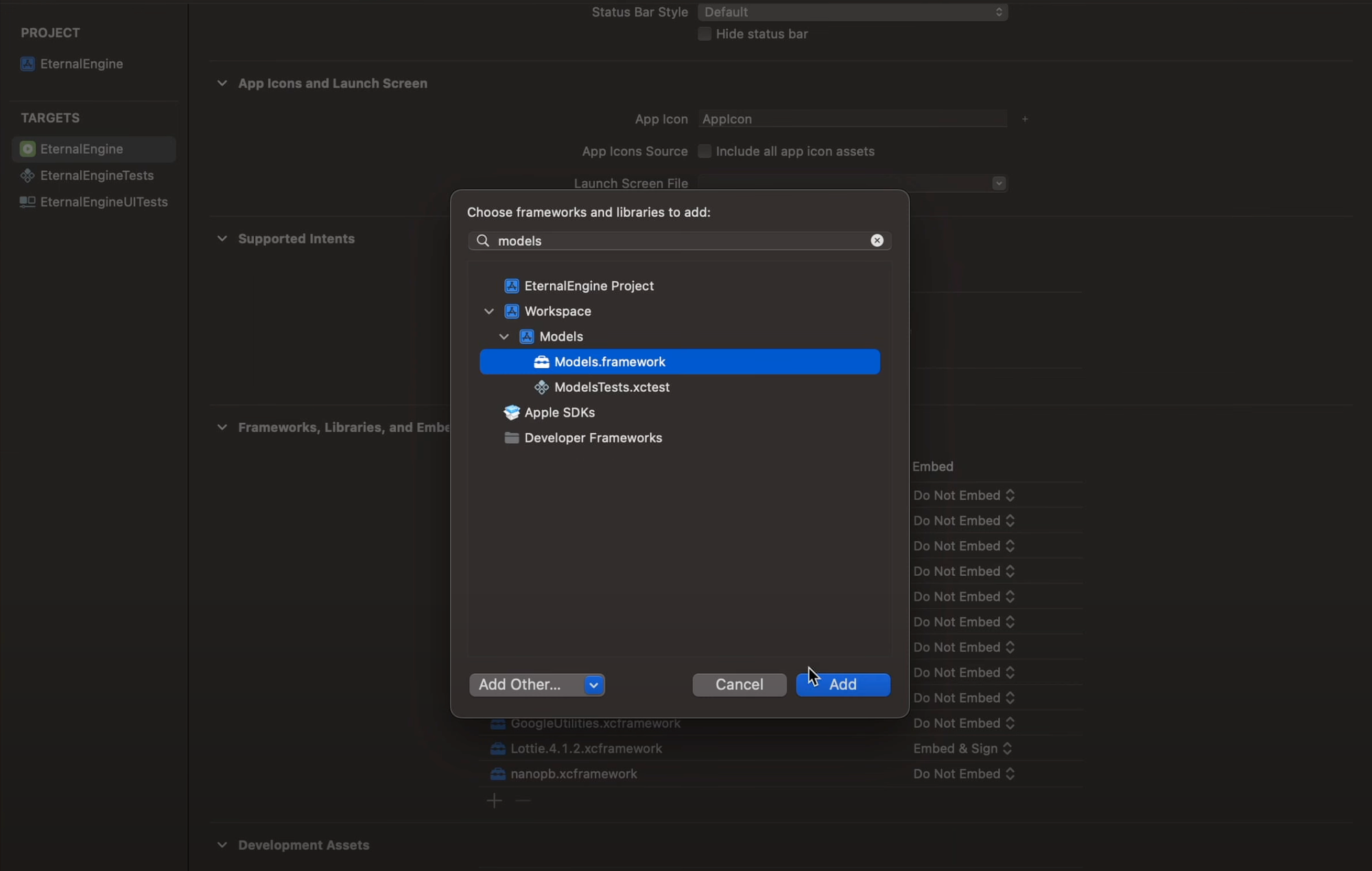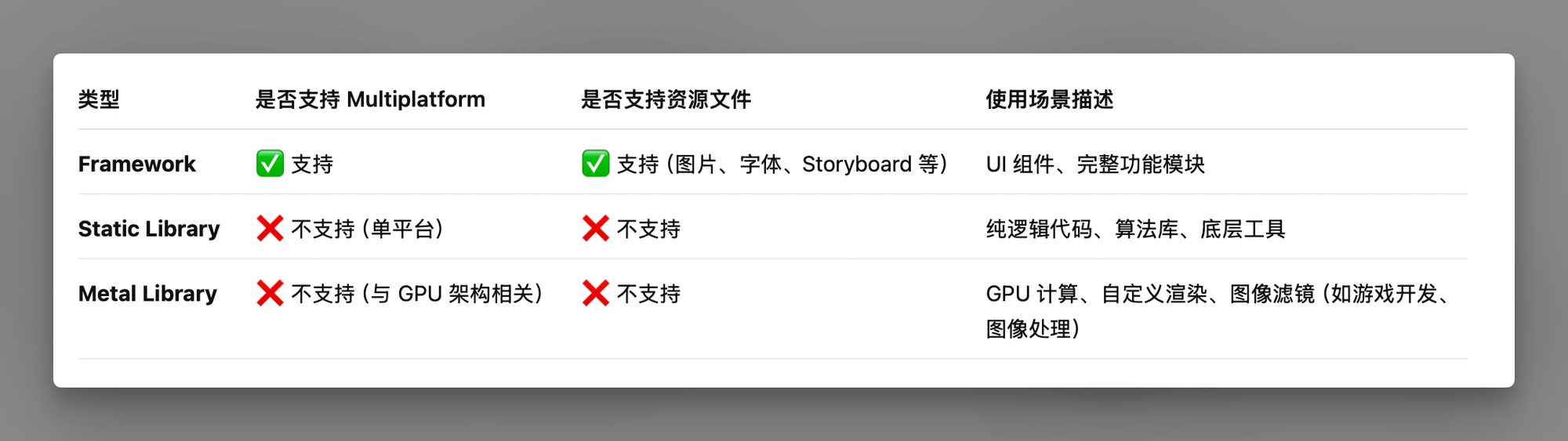 Framework 的能力非常接近 Project,但不包含 .app 文件,它是被设计成一种可复用模块,供其他 App 或 Framework 使用。