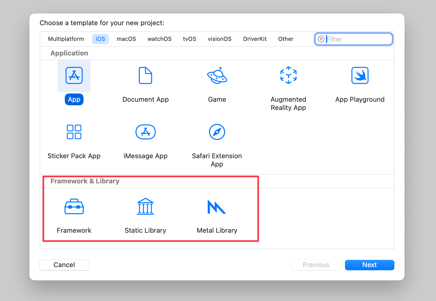 在 Xcode 中创建 Framework & Library 时,可以看到 3 个选项: