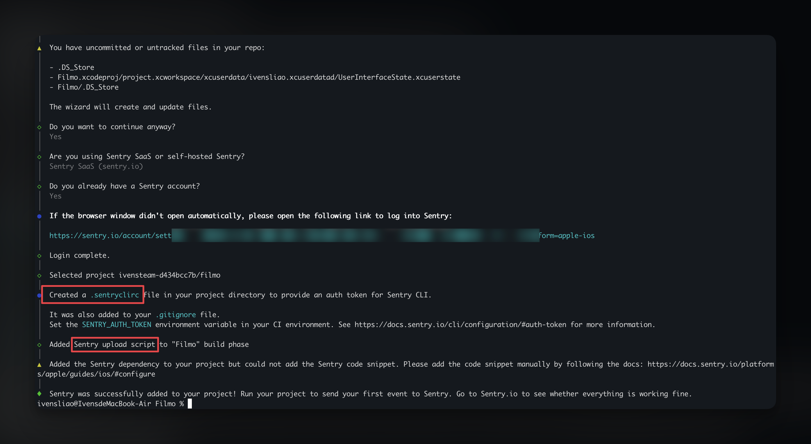 brew install getsentry/tools/sentry-wizard && sentry-wizard -i ios运行以上命令,会自动完成: