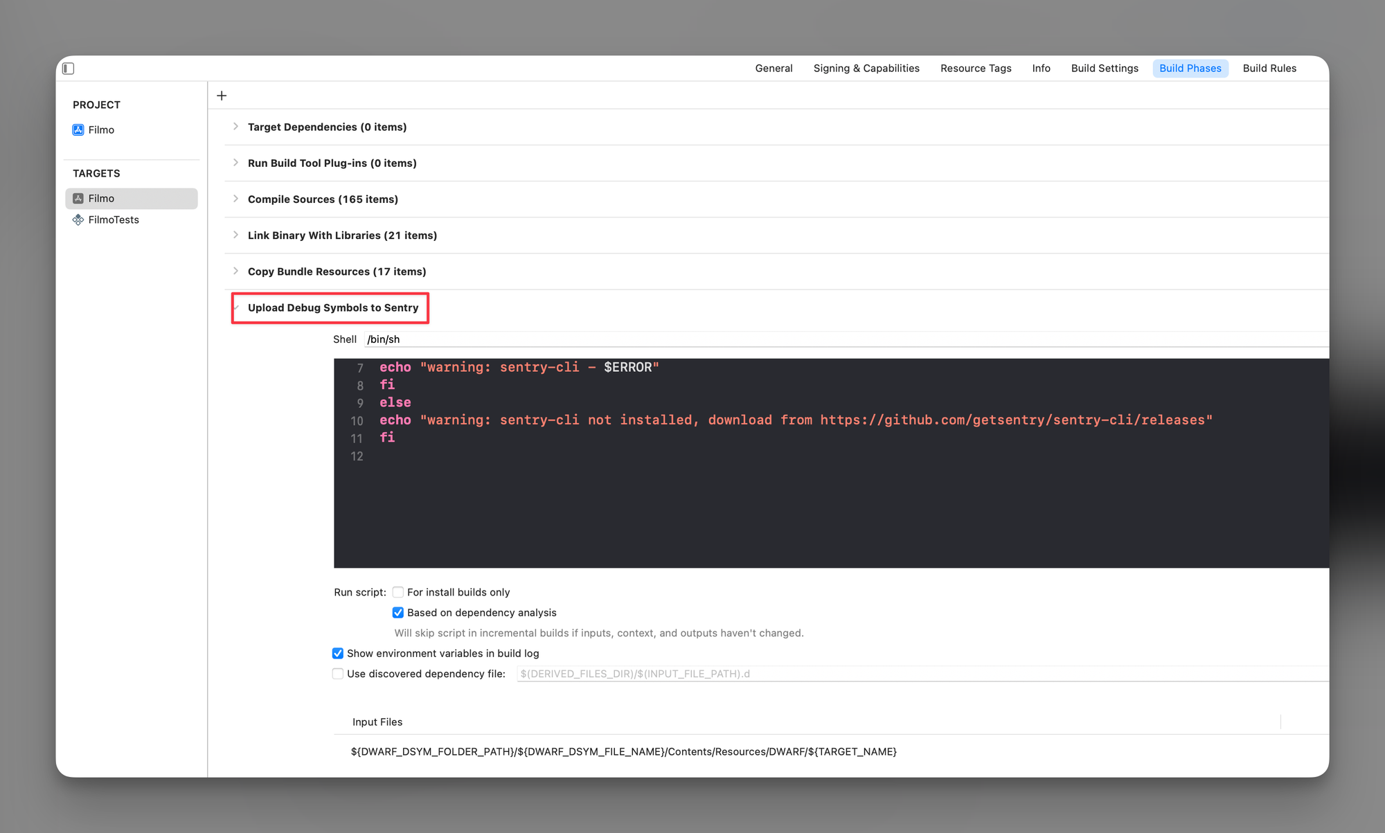 .sentryclirc文件,该文件会保存 Sentry 的Auth Token。 - 在 Xcode 的 build phase 中添加 「Upload Debug Symbol to Sentry」