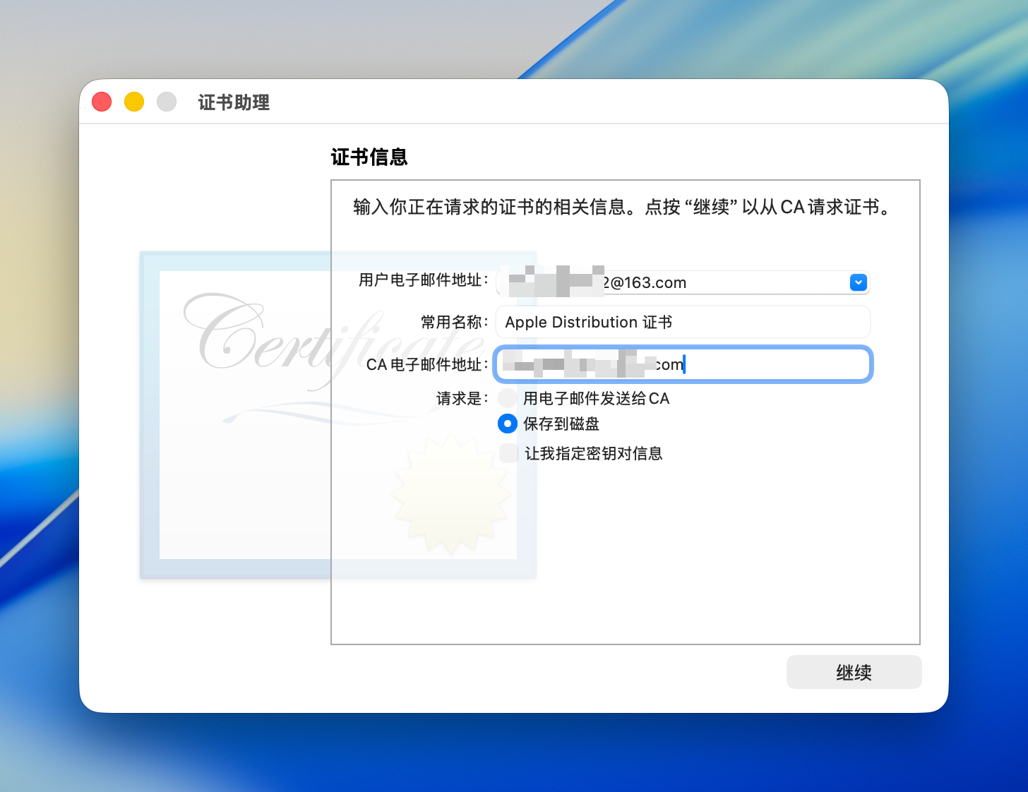 打开钥匙串访问 → 证书助理 → 从证书颁发机构请求证书。