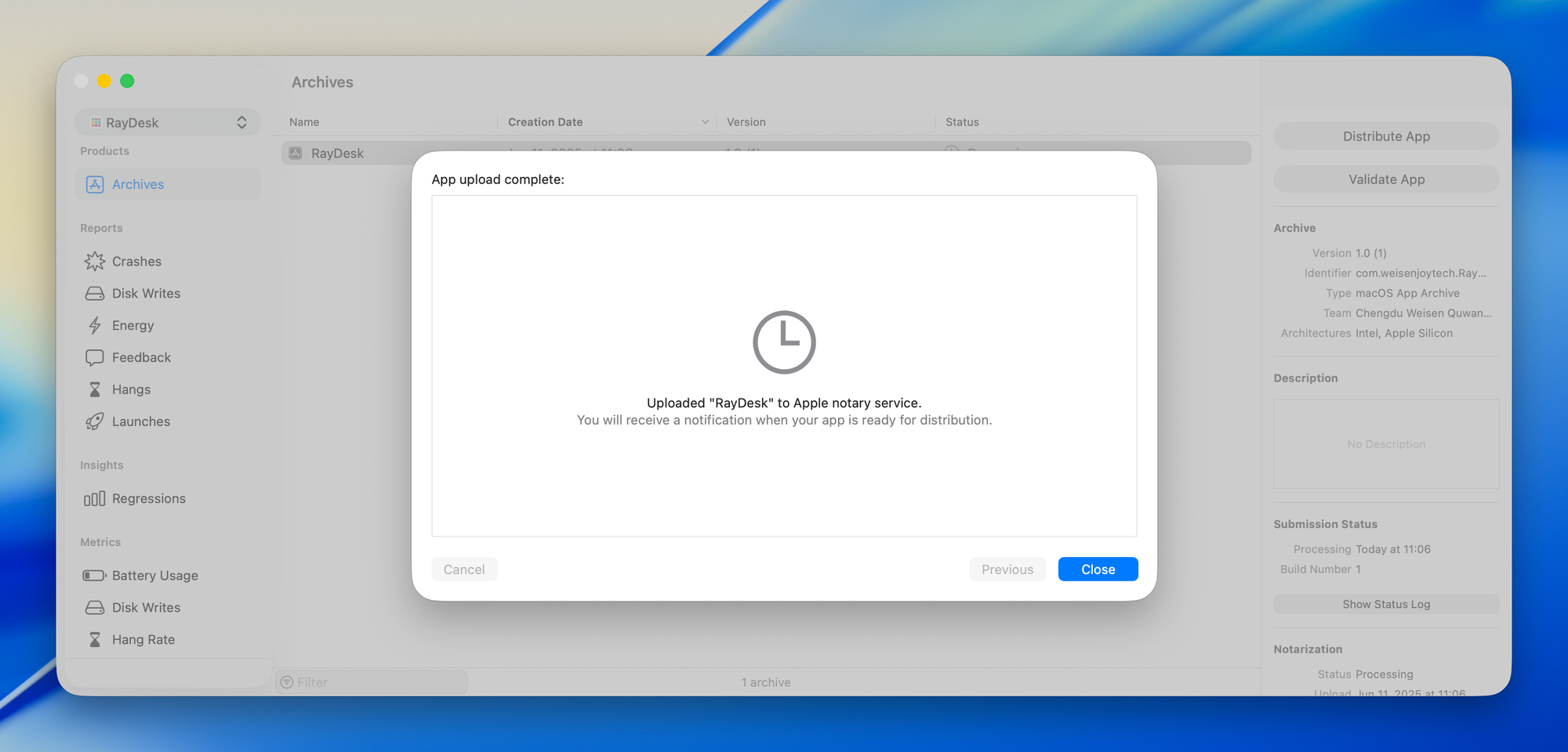 macOS 从 Catalina(10.15)开始对分发应用增加了一个安全性要求:你必须把你的 .app(或 .pkg、.dmg)上传给 Apple 做一次扫描验证,确保没有恶意内容。