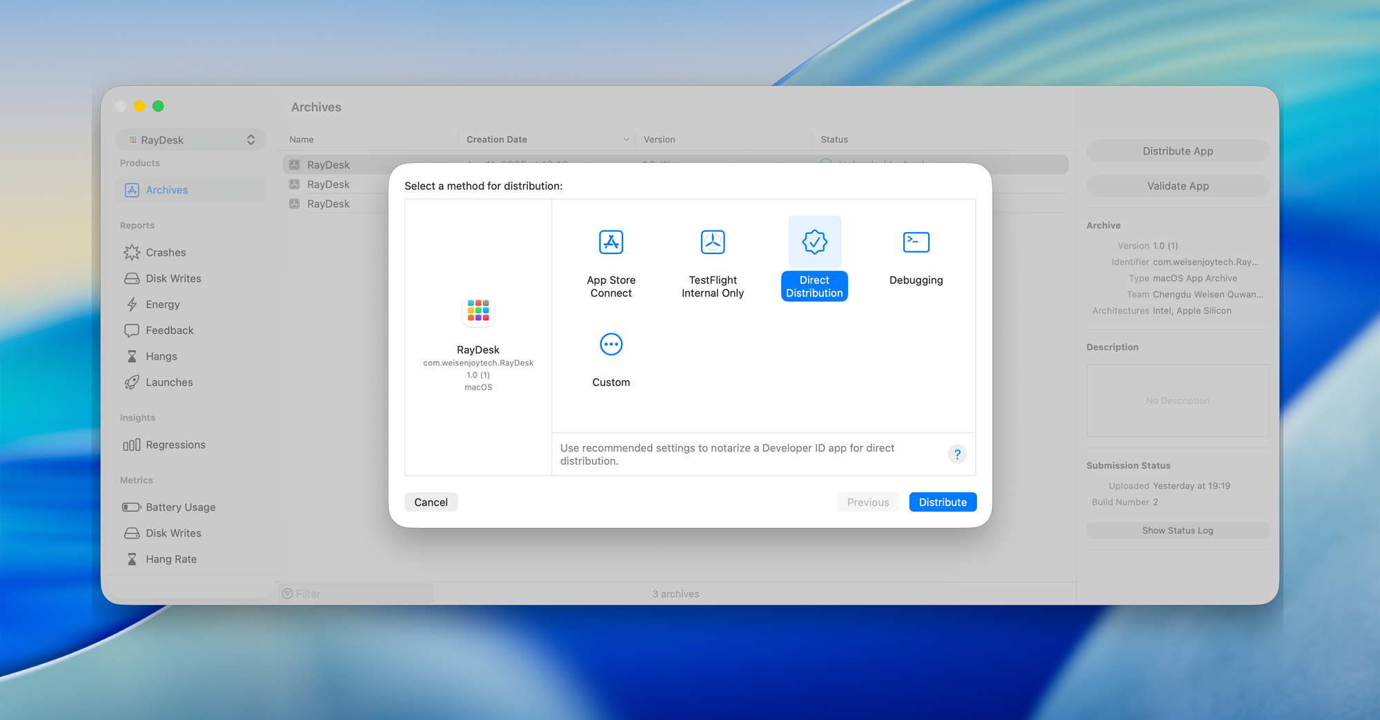 Archive 打包之后,选择 Distribute App,选择 Direct Distribution: