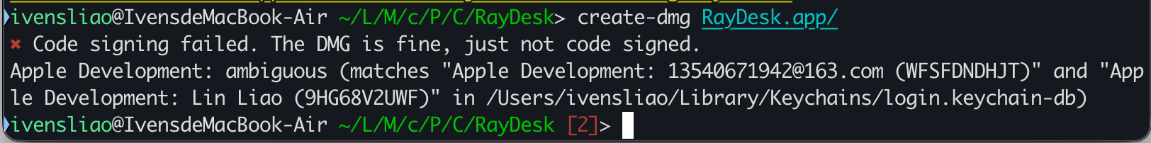 create-dmg 不知道应该使用哪一个来签名,因此提示 ambiguous(歧义)。