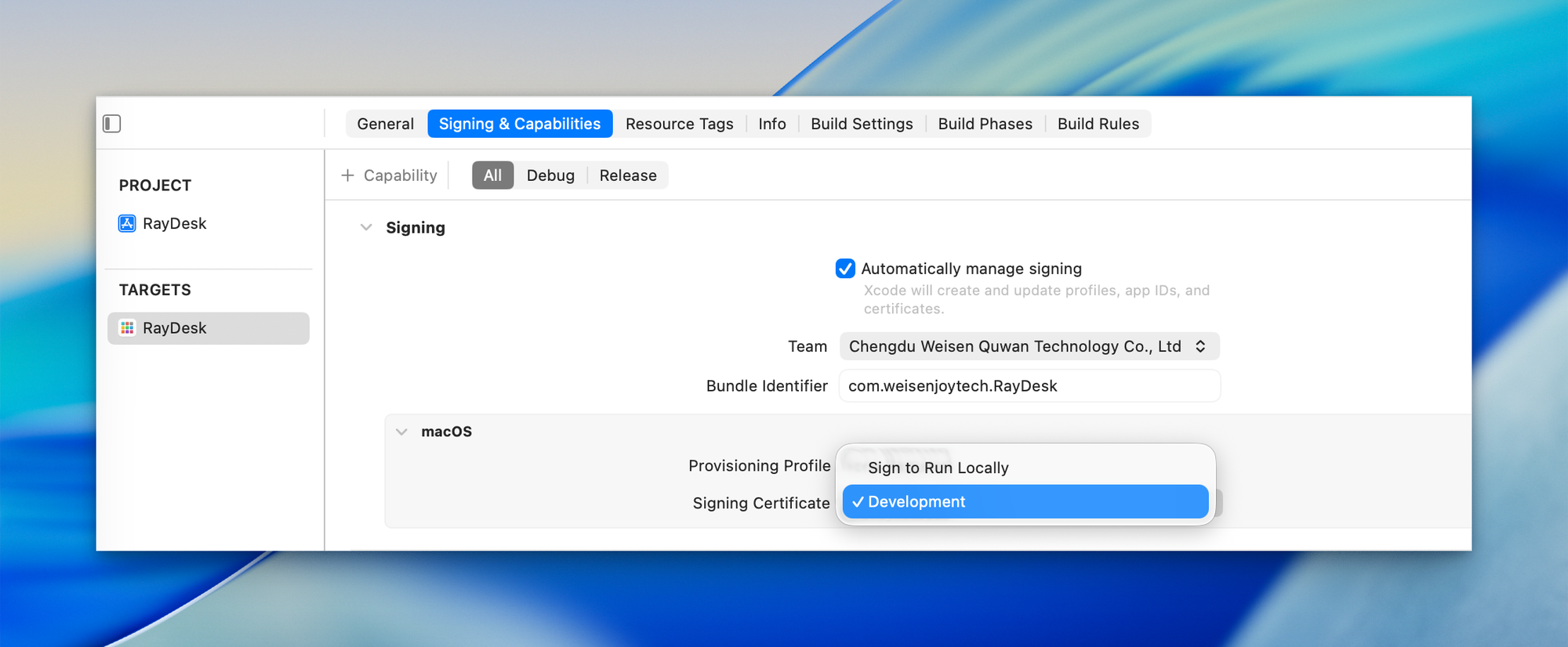 在 Xcode 中,虽然可以设置 Signing Certificate,但 Sign to Run Locally 选项仍然是 Apple Development 证书的一种,在本地 Mac 上运行,无需设备注册,但不能分发。