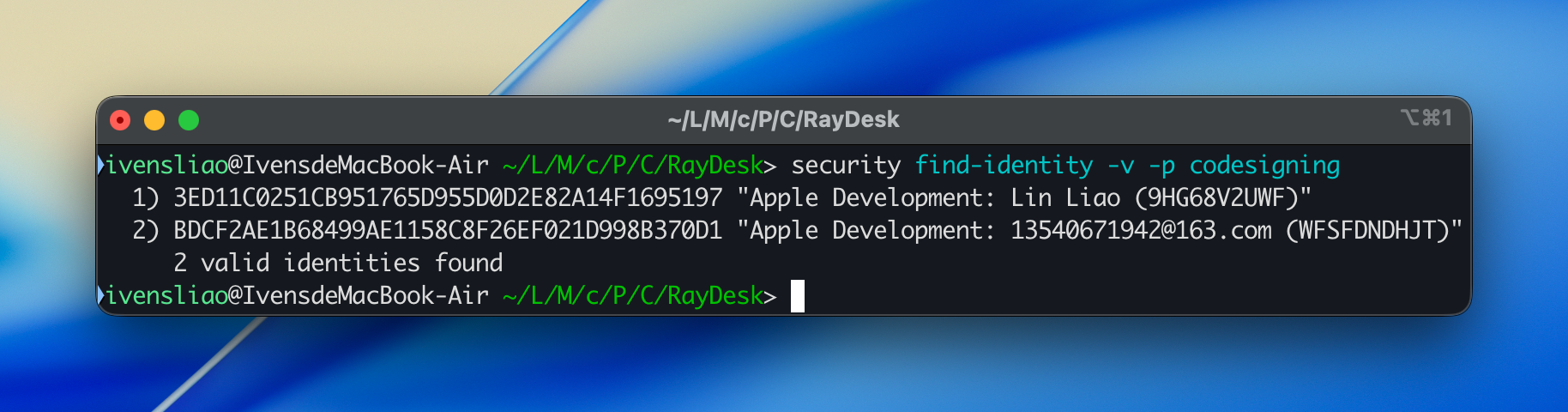 钥匙串(Keychain)中有两个名称相近的 “Apple Development” 证书: