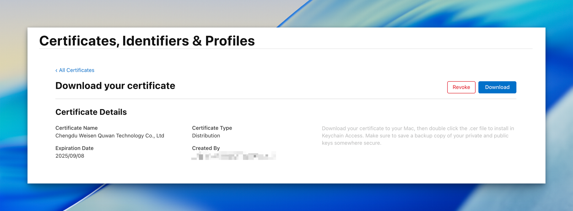 - 在 Apple Developer 网站创建 Developer ID Application 证书