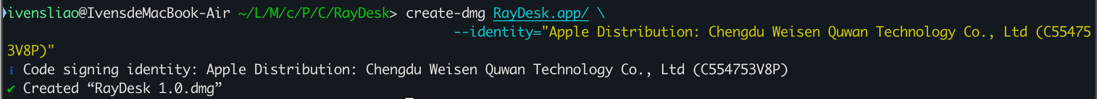 这表明:代码签名失败,但 .dmg 文件本身已经成功生成。它仍然可以用,但不会通过 Gatekeeper 的完整校验,影响发布或用户安装时的信任度。