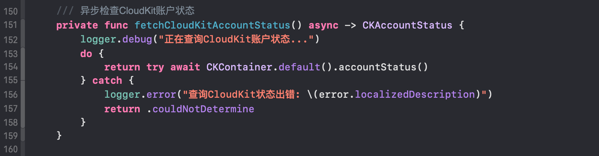 我们可以创建一个 fetchCloudKitAccountStatus() 方法,用于获取同步状态,并添加 logger 输出: