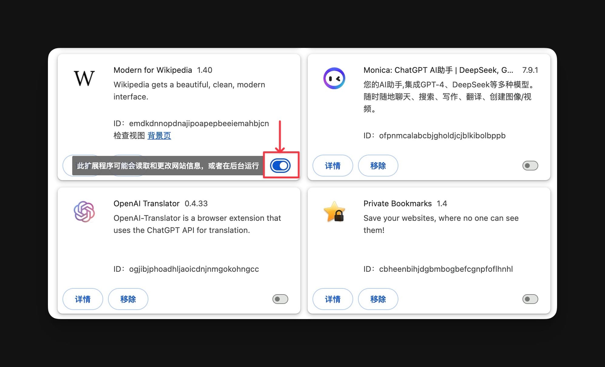 - 最后一步。在所有扩展程序中,重新手动启用扩展即可: