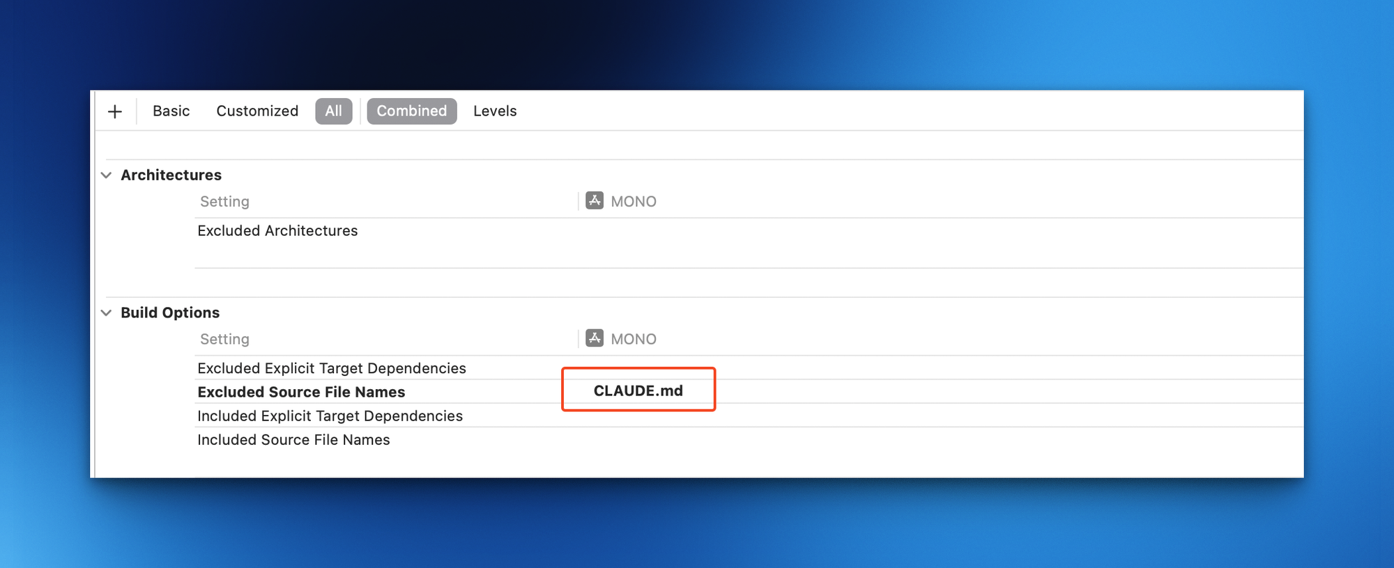 在项目设置中选择 Build Settings,搜索 "Excluded Source File Names",添加 CLAUDE.md。这样就可以在编译时排除这个文件。
