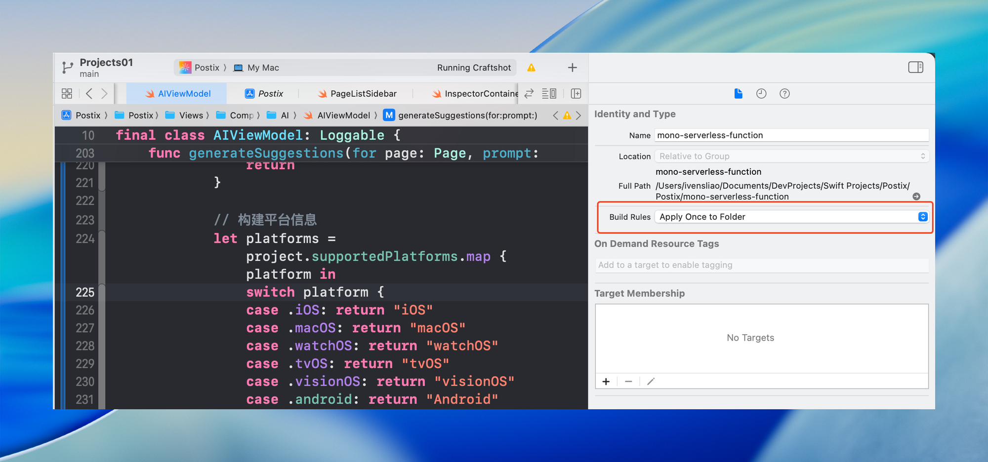 在 Xcode 中,选中文件夹,打开右侧的 Inspector。将 Build Rules 修改为 Apply Once to Folder 即可。