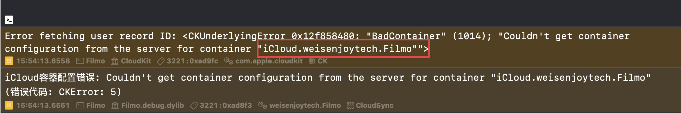 例如,Xcode 控制台中显示的容器 ID 为 iCloud.weisenjoytech.Filmo: