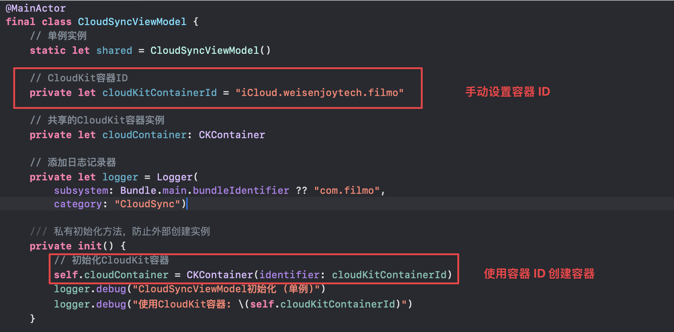 在后续代码中,通过 cloudContainer.accountStatus() 这种方式调用接口,而不是 CKContainer.default().accountStatus()
