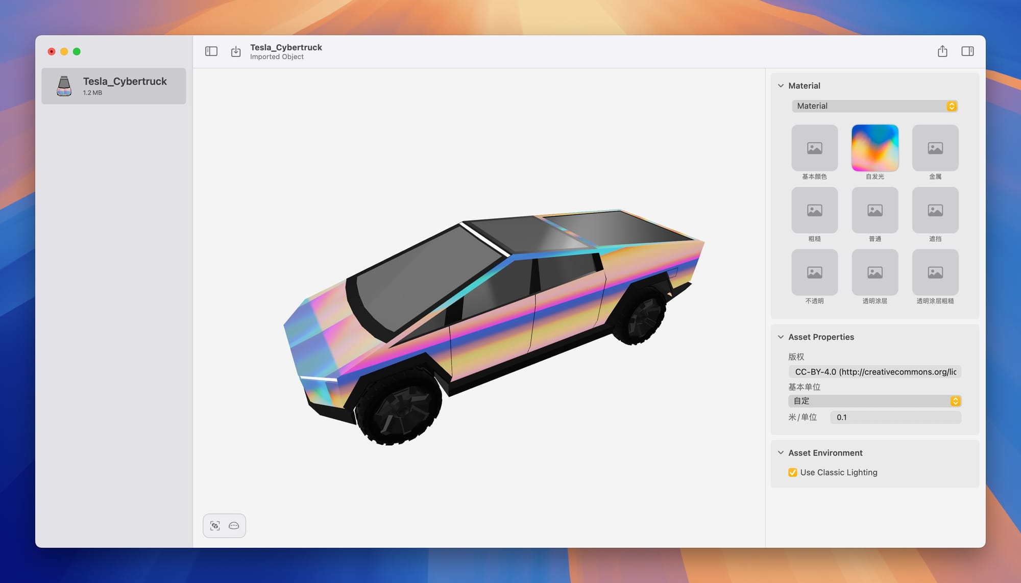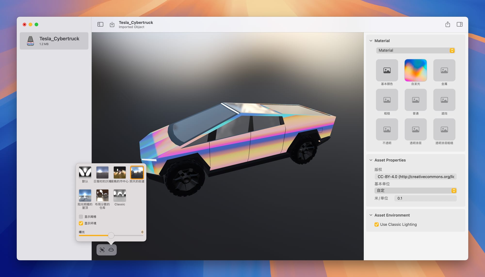 Reality Converter 不仅可以用来转换格式,还可以修改模型文件。在最新的 Beta 6 版本中(截止 2024 年 7 月),你可以使用 Reality Converter 来编辑模型文件,例如修改纹理、自定义材质属性等。通过所见即所得(WYSIWYG)设计,您甚至可以轻松预览各种光照条件下的虚拟内容。