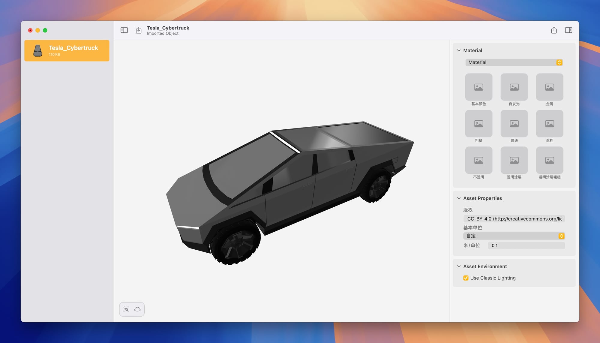 可以添加自定义的 Material 素材,Reality Converter 会自动应用并更新预览: