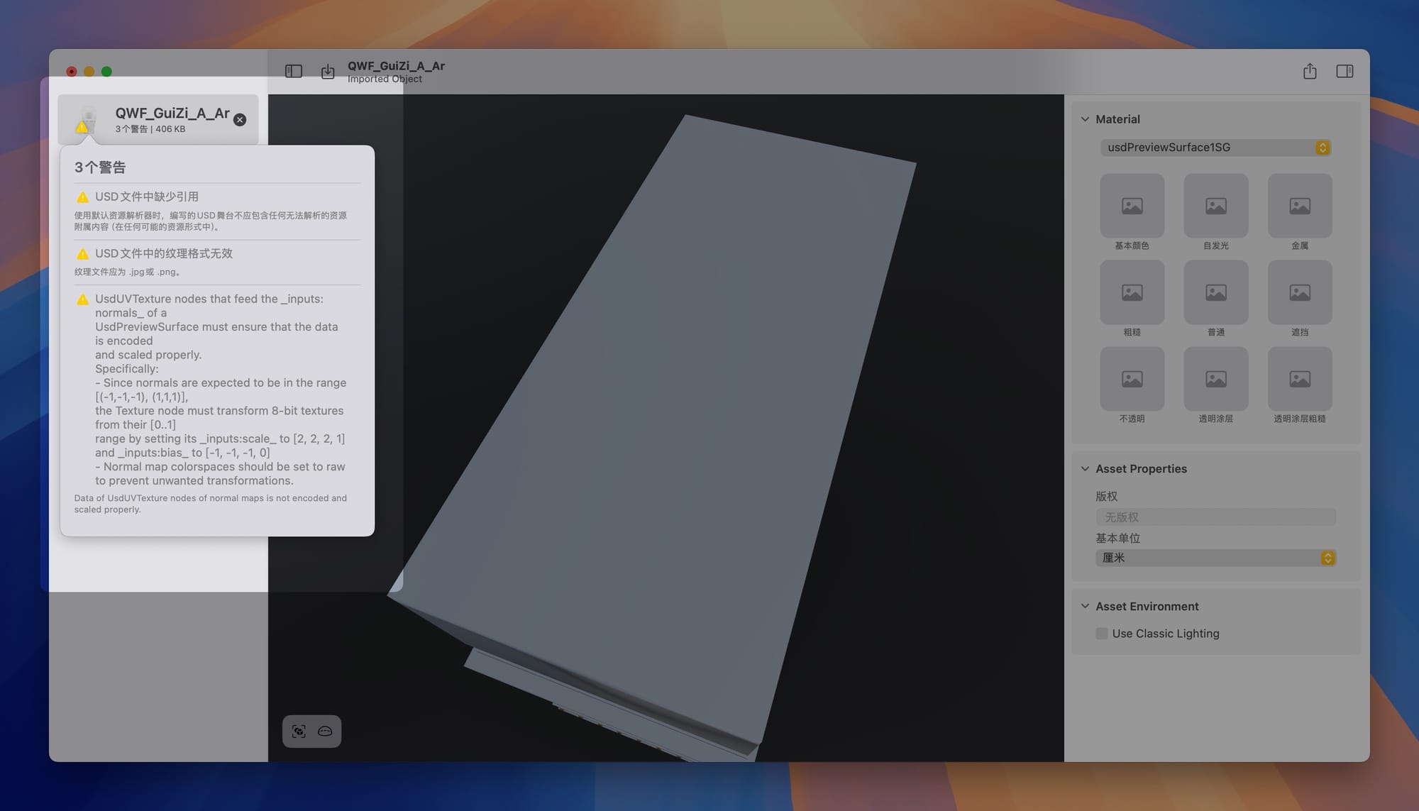 当文件被导入时,Reality Converter 会检查文件结构是否符合 USDZ 格式的转换标准,例如纹理、材质、动画等。如果符合规范会自动转换为 USDZ 格式。否则,会提示错误。