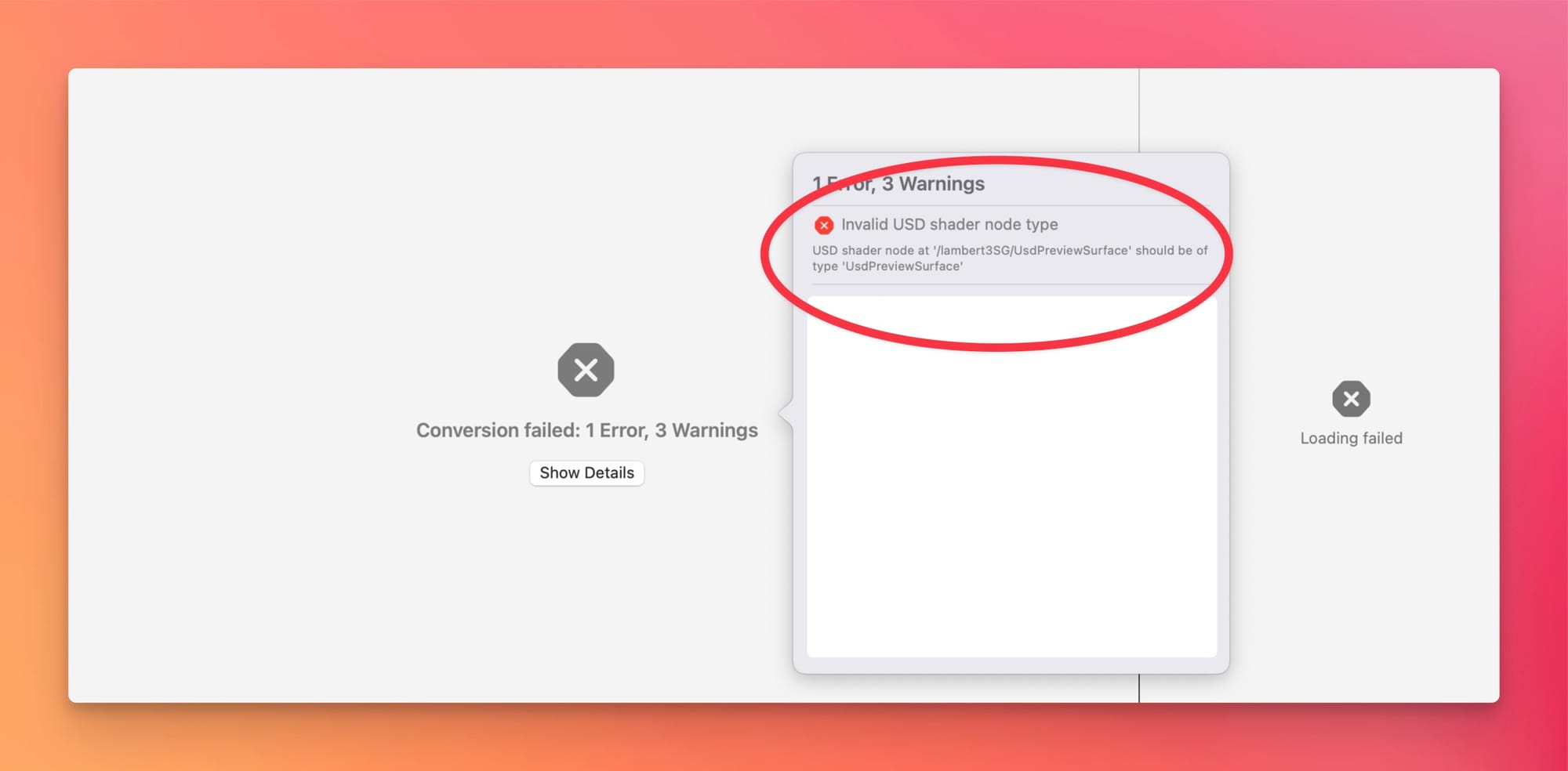 如果模型的着色器使用了非 UsdPreviewSurface 类型的材质节点,如传统的 lambert 或其他非标准类型,就会触发此错误。