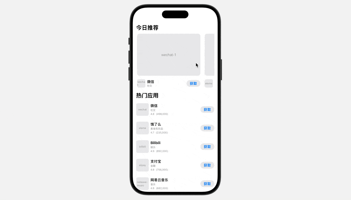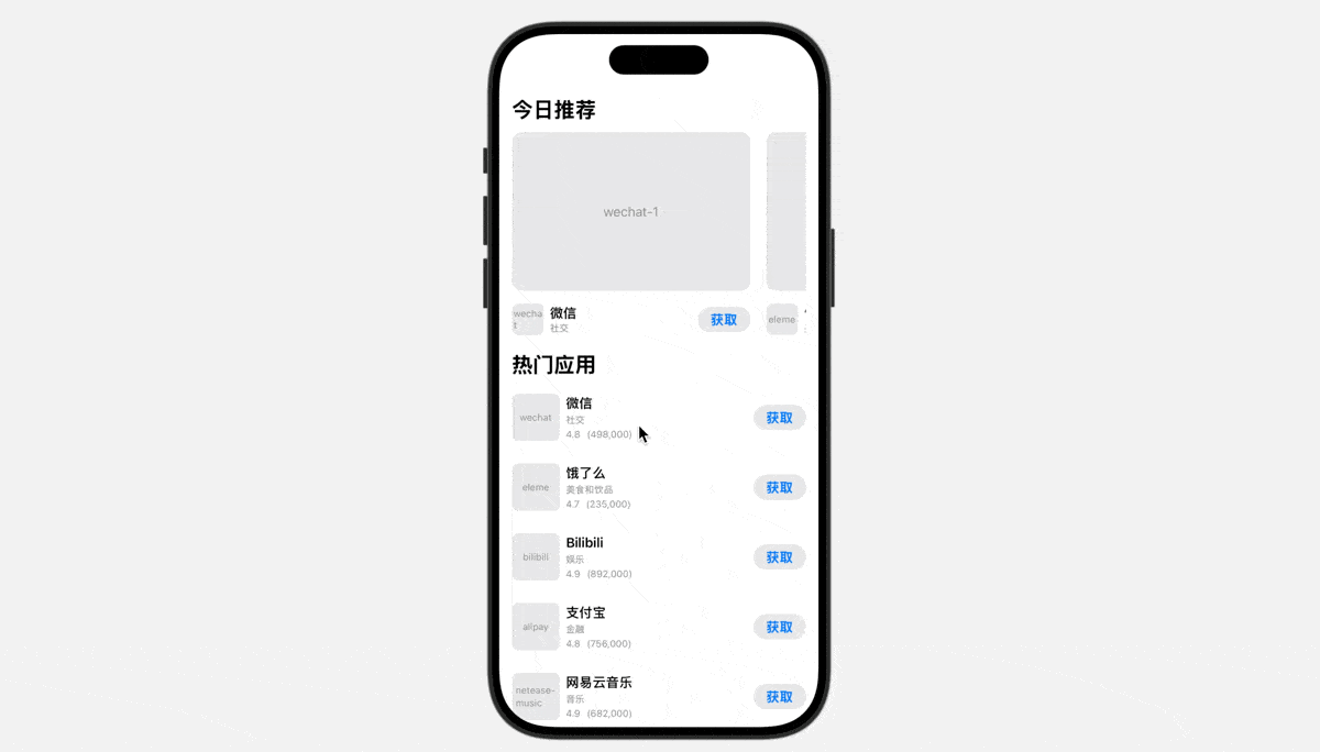 我们创建如下实示例代码,创建苹果 App Store 的卡片式 UI 布局效果: