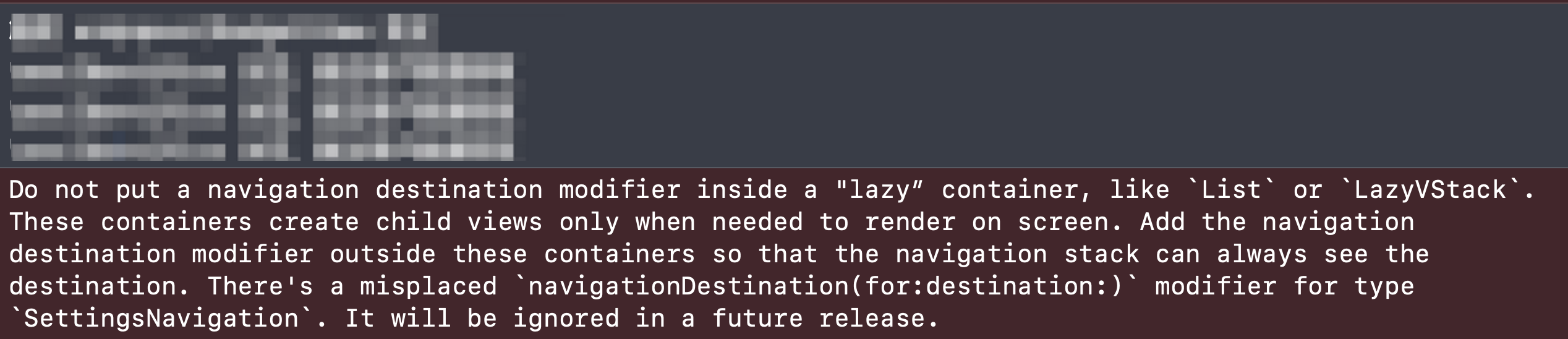 Do not put a navigation destination modifier inside a "lazy” container, like `List` or `LazyVStack`. These containers create child views only when needed to render on screen. Add the navigation destination modifier outside these containers so that the navigation stack can always see the destination. There's a misplaced `navigationDestination(for:destination:)` modifier for type `SettingsNavigation`. It will be ignored in a future release.