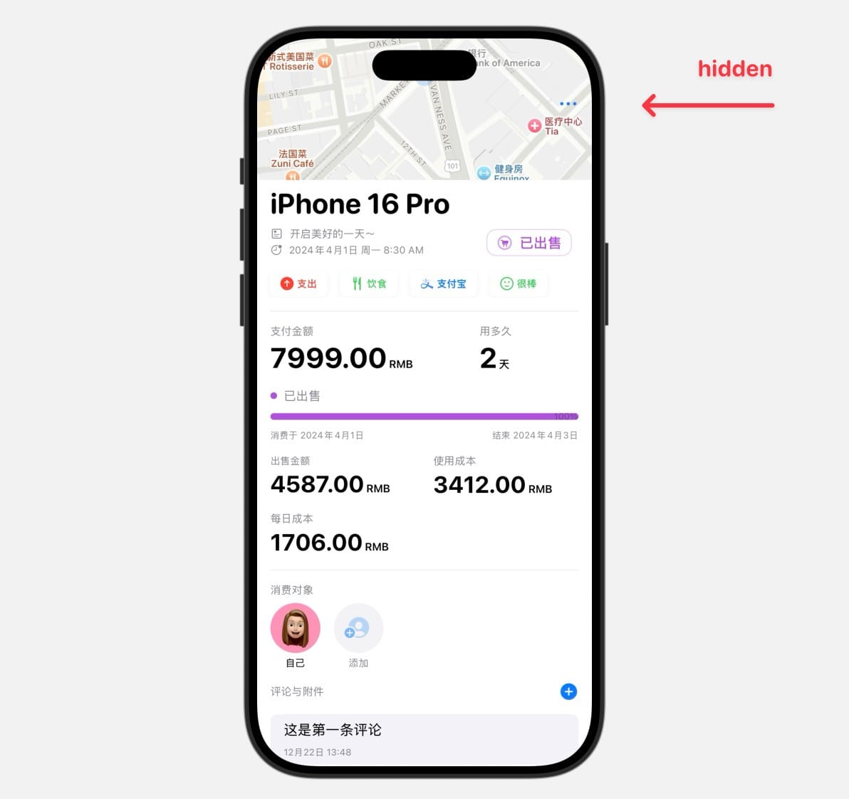在某些情况下,我们可能并不需要导航栏。比如设置了 .navigationTransition() 效果之后,可以直接侧滑或下滑来返回,因此并不需要这个返回按钮。