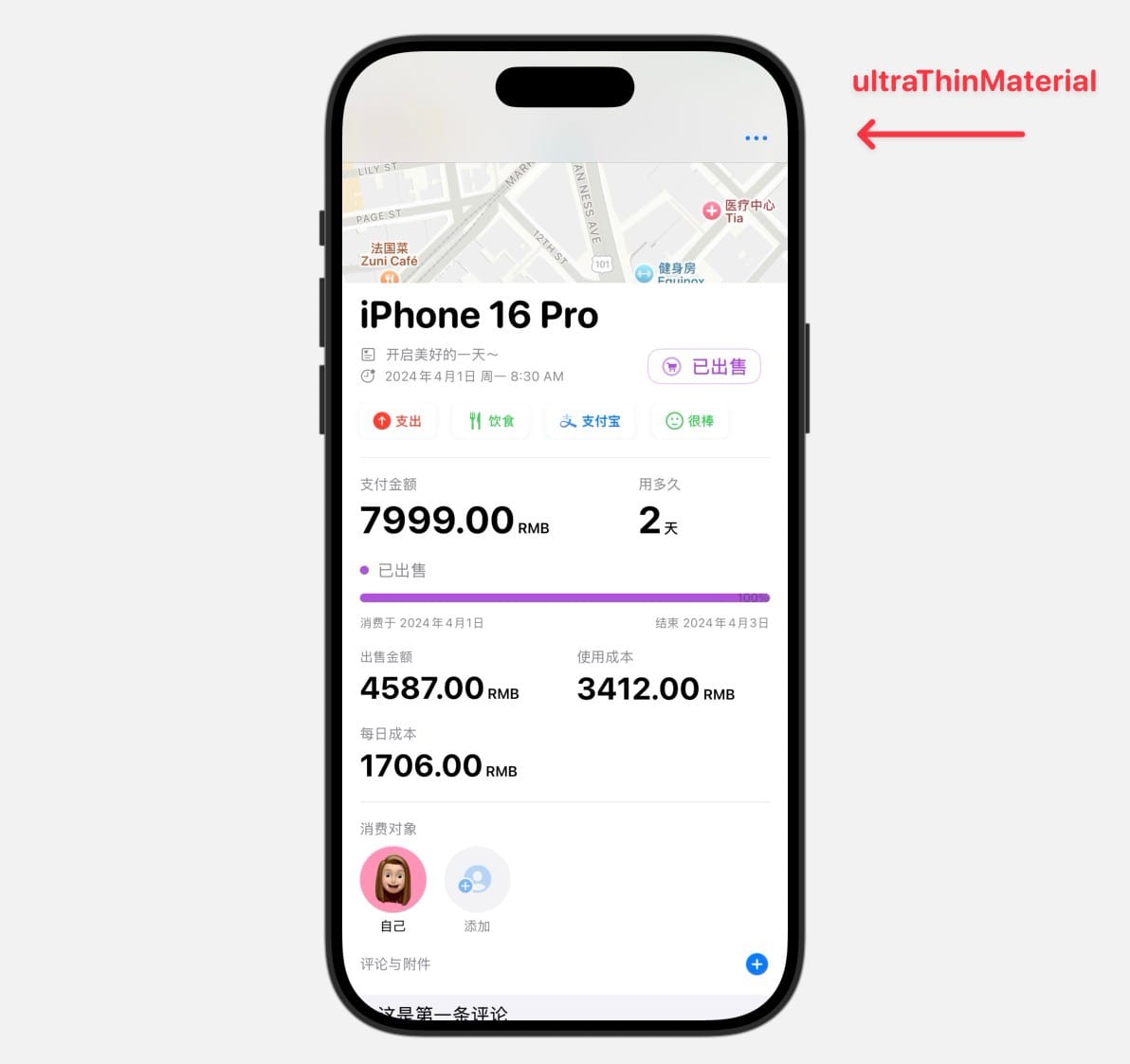 默认情况下,导航栏使用 .regularMaterial 材质,我们可以修改使用更浅的材质:
