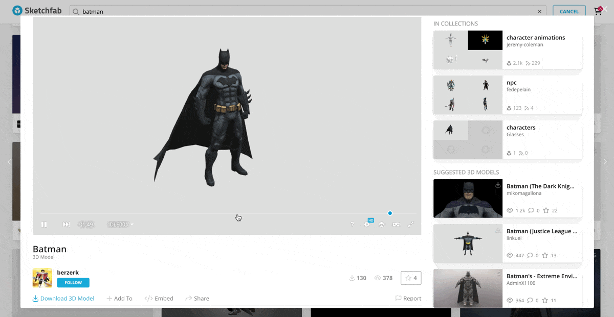 通过在 Price 中筛选 Free,可以找到免费下载的模型资源,同样也可以通过 Animated 标签筛选是否包含动画: