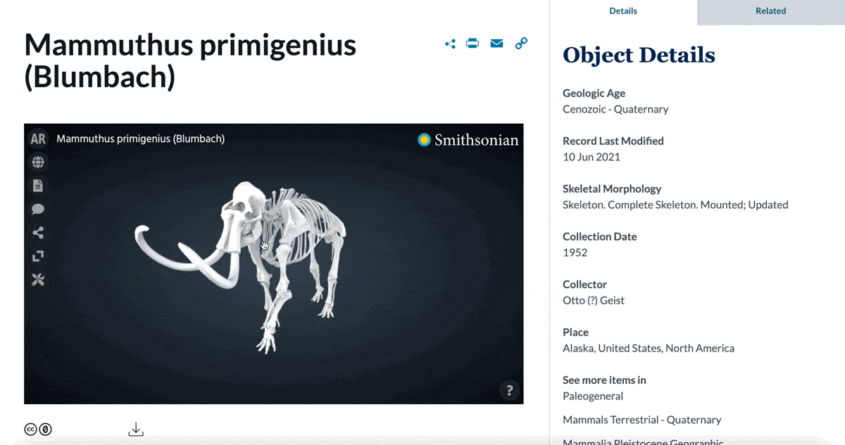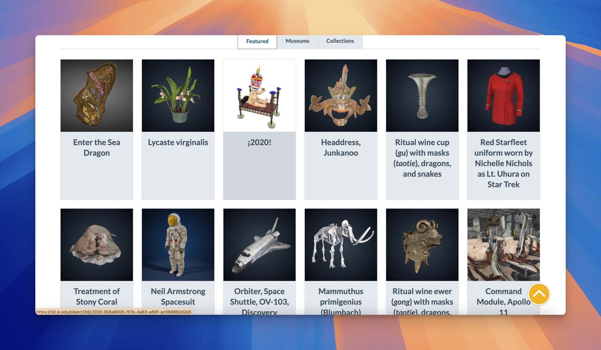 Smithsonian(史密森尼学会)是世界上最大的博物馆、教育和研究机构之一,总部位于美国华盛顿特区。史密森尼学会创建了一个网站 Smithsonian 3D,提供了大量的 3D 模型供公众免费下载和使用。这些模型涵盖了广泛的主题,从历史文物到自然历史标本,应有尽有。