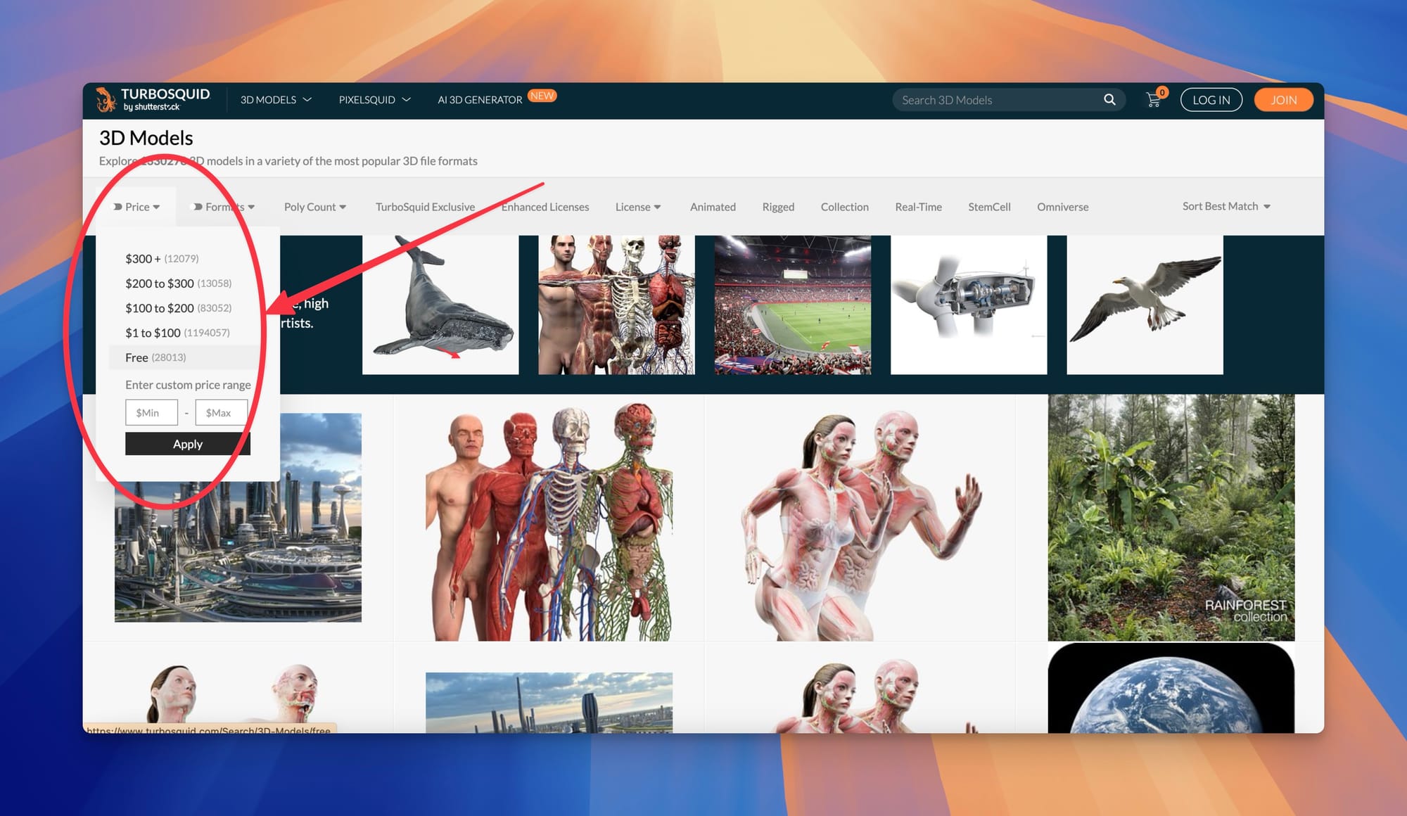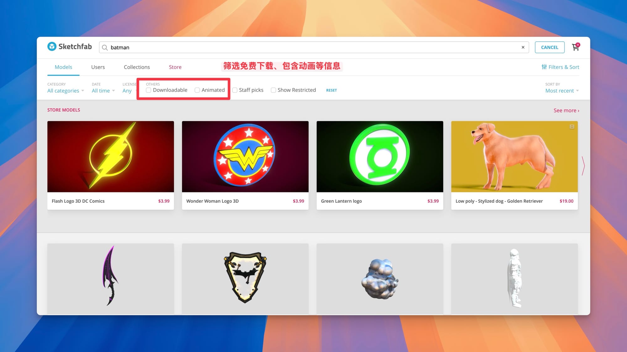 Sketchfab 包含免费模型和付费模型,你可以在搜索结果上方进行筛选: