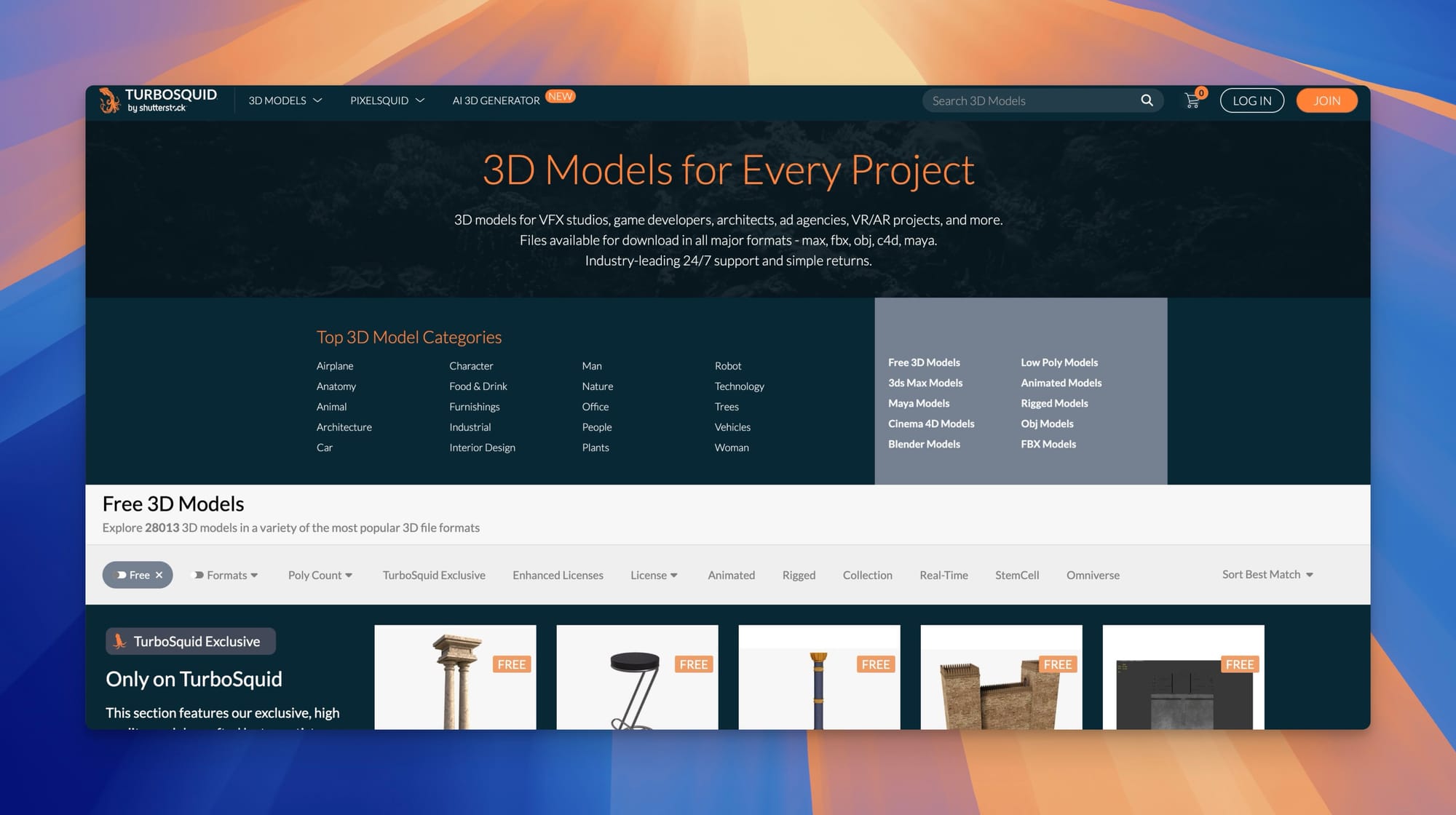 官网地址:https://www.turbosquid.com/Search/3D-Models/free