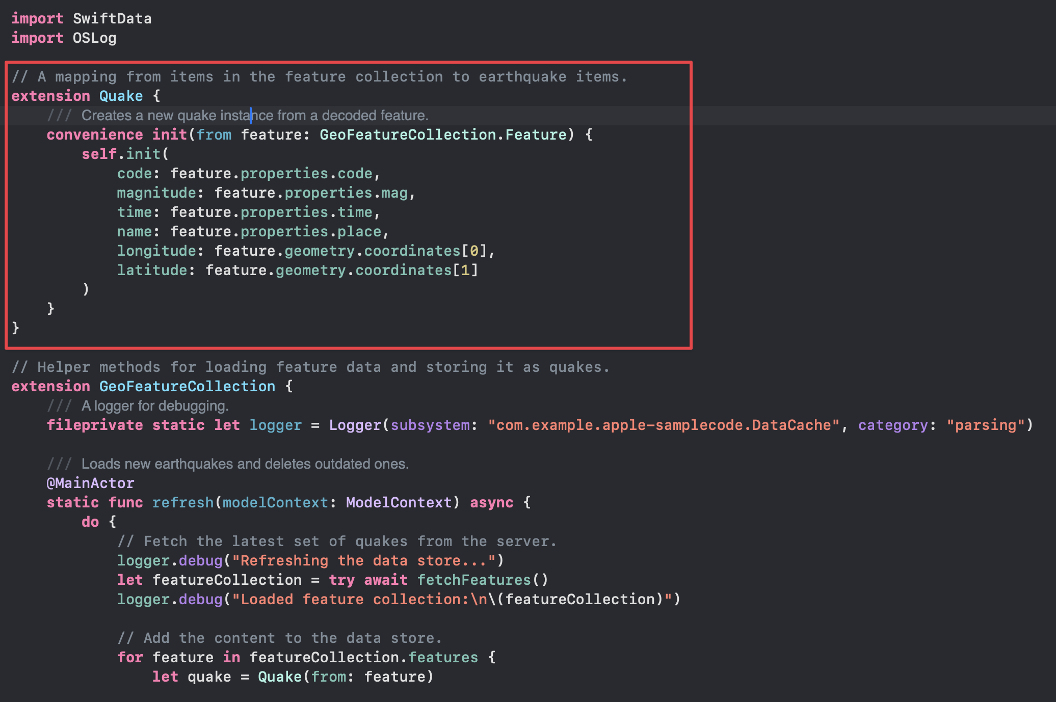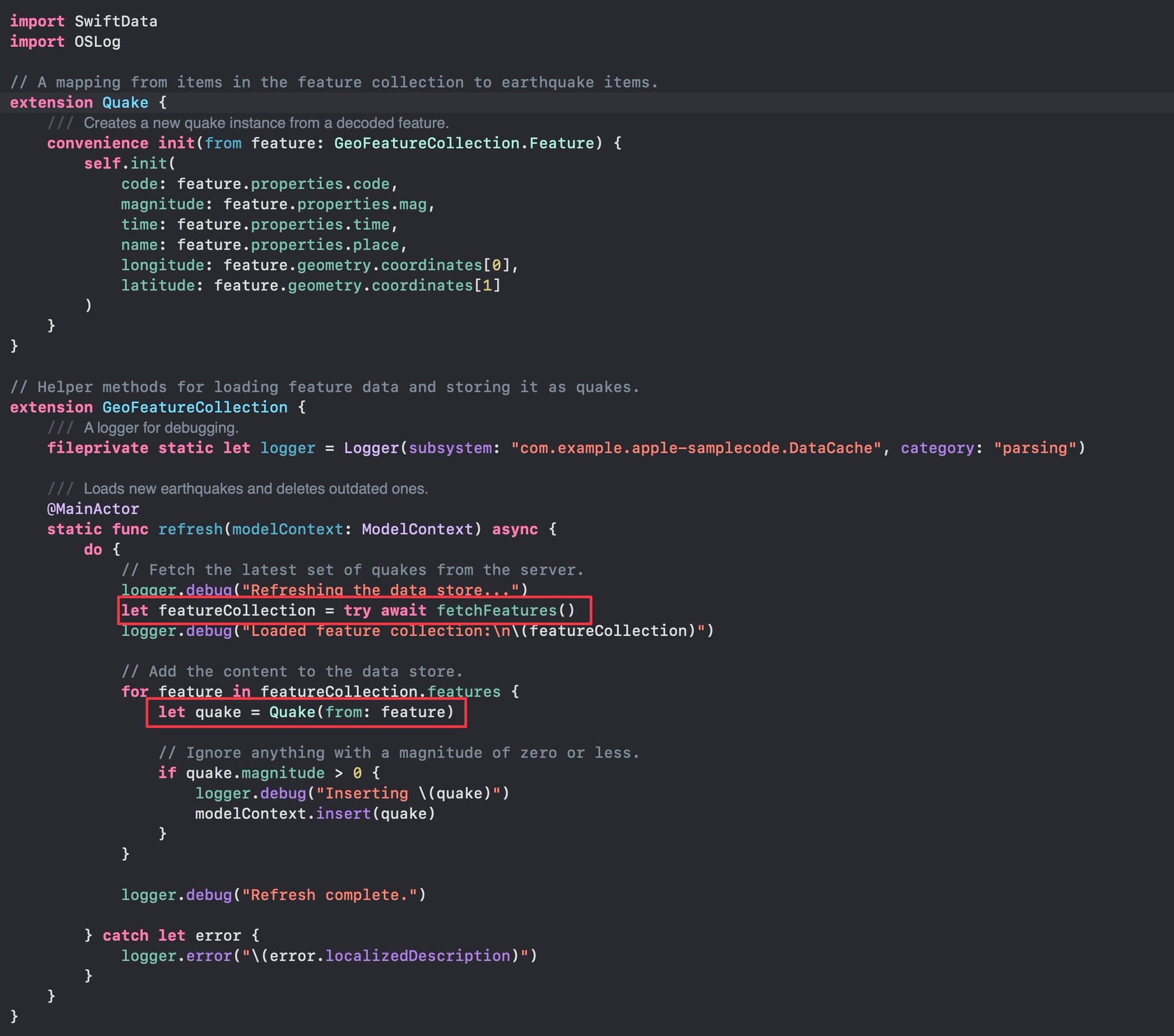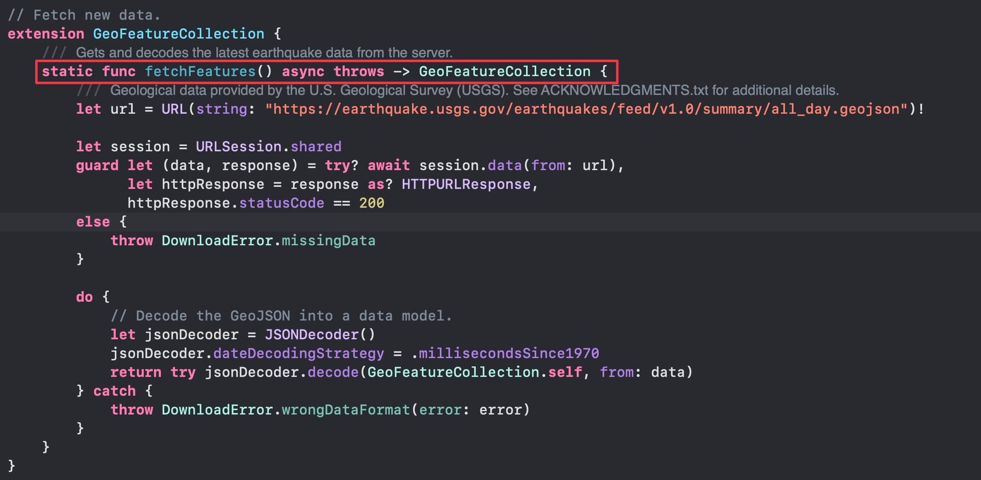 func fetchQuakes() async throws -> GeoFeatureCollection {