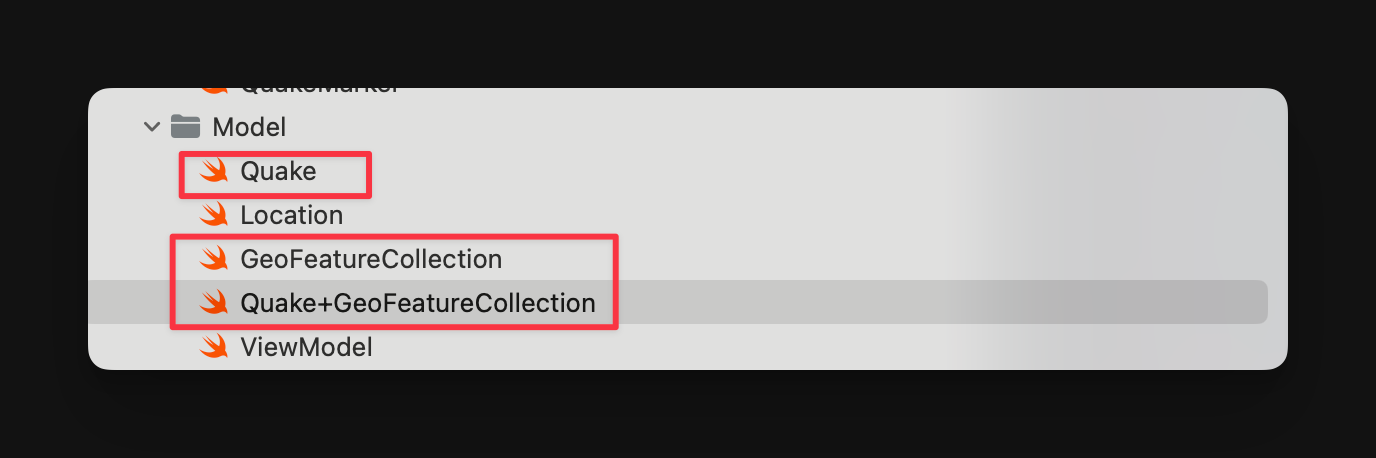 - 项目首先创建了 Quake 数据模型,但并没有实现 Codable 协议: