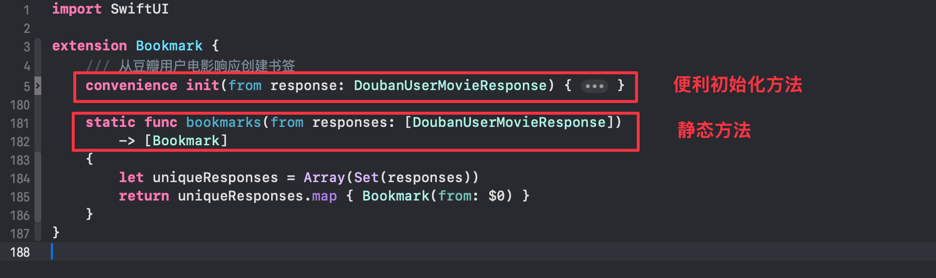 在「SwiftData + DTO 结构体文件」文件中,创建一个 SwiftData 模型的扩展,并在其中创建一个便利初始化方法,完成 DTO -> Model 的转换: