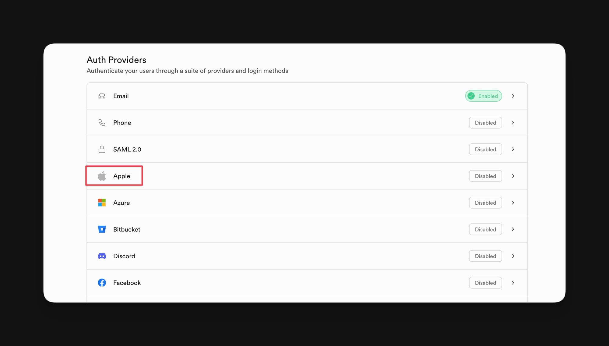 在 Project -> Authentication -> Sign In/Up 中,启用 Apple 选项:
