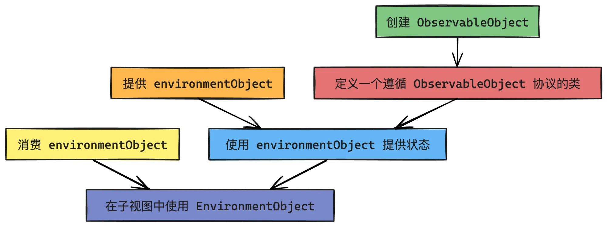 }通过这种方法,SwiftUI 的 EnvironmentObject 提供了一种简洁而高效的方式来管理全局状态,使得在复杂的视图层次结构中共享和更新状态变得更加容易。