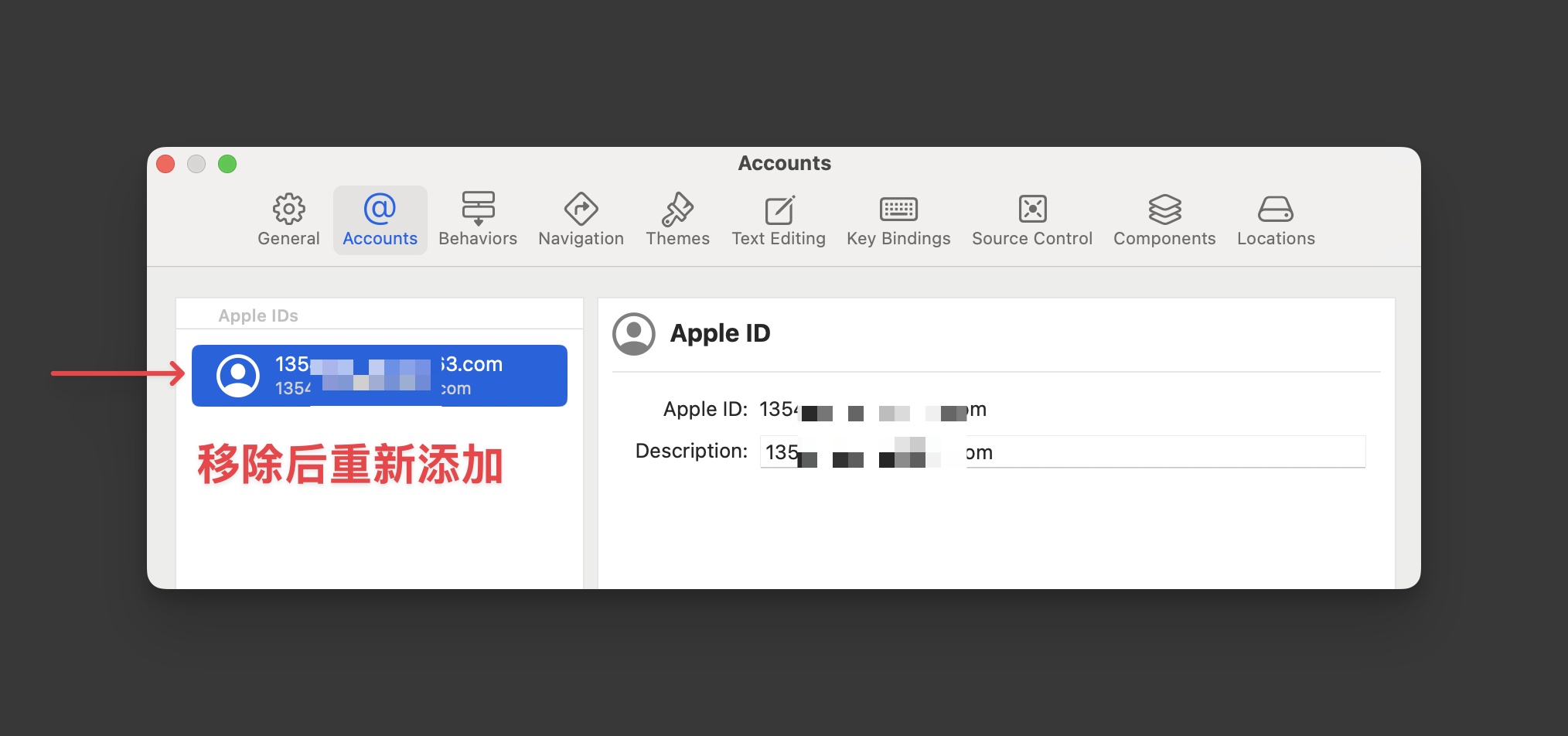 在 Xcode 设置中,删除 Accounts 下的账户,然后重新登陆: