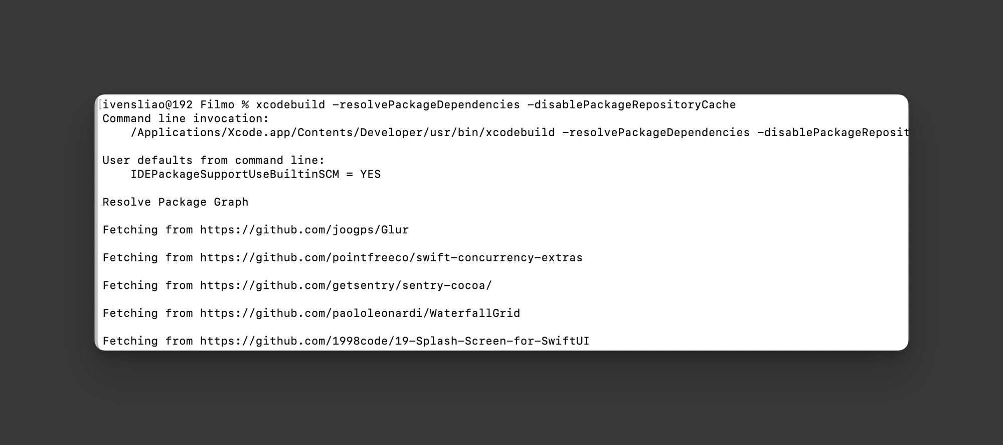 xcodebuild -resolvePackageDependencies -disablePackageRepositoryCache