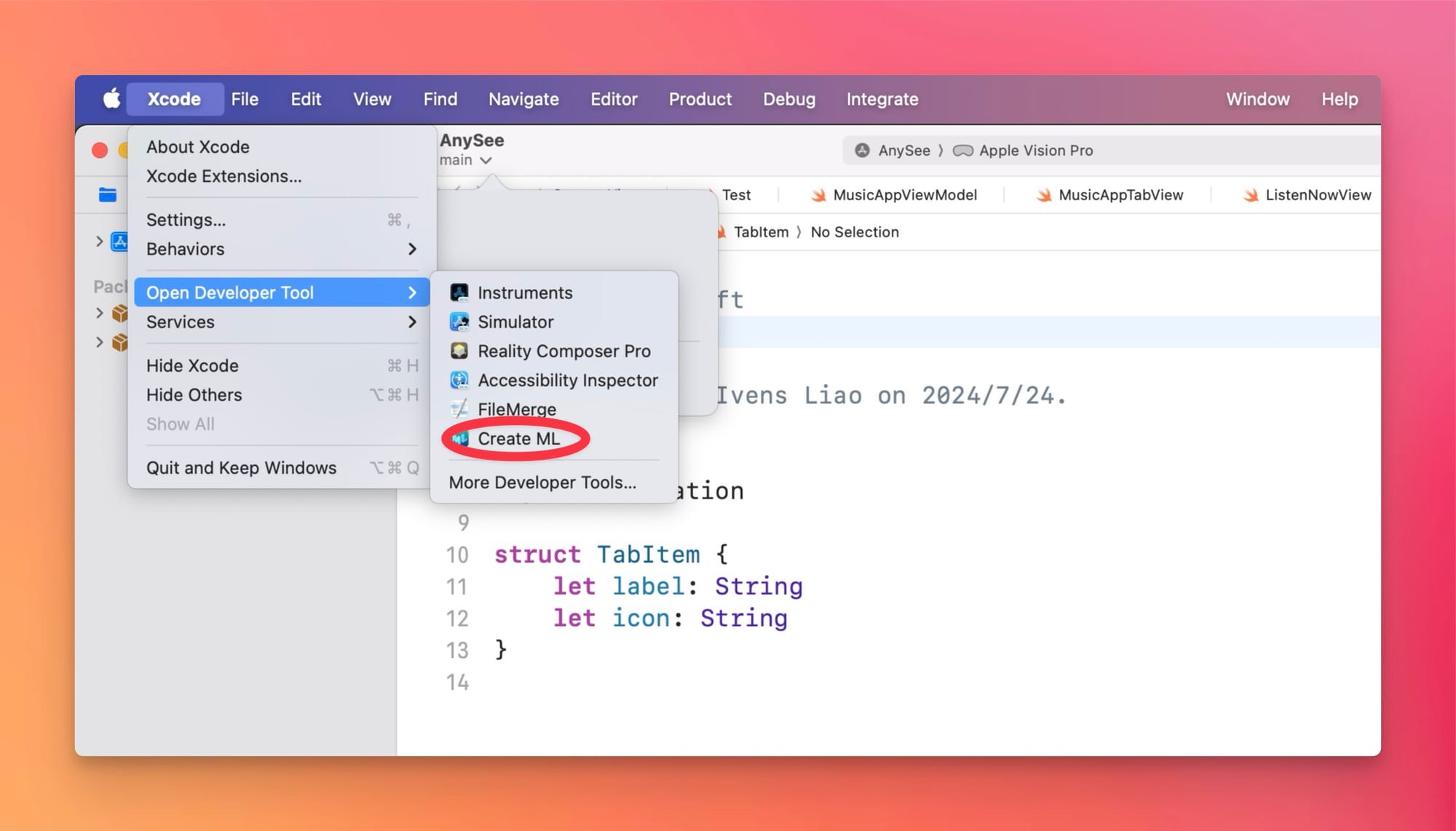 安装方式:Create ML 是 Xcode 的一部分,会随着 Xcode 一起安装。你可以点击 Xcode -> Open Developer Tool -> Create ML 来打开: