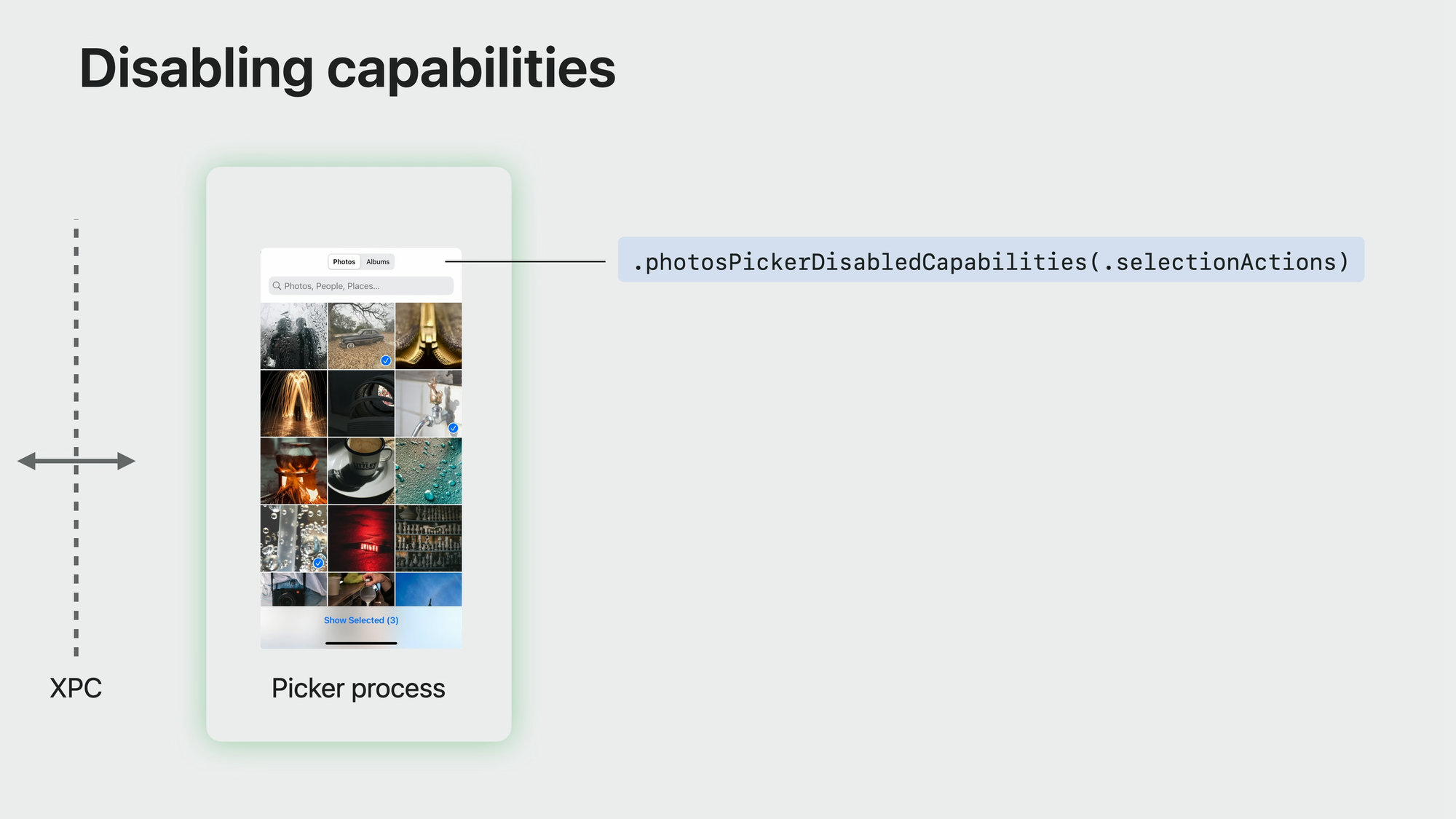 使用 .photosPickerDisabledCapabilities 隐藏选择器指定元素