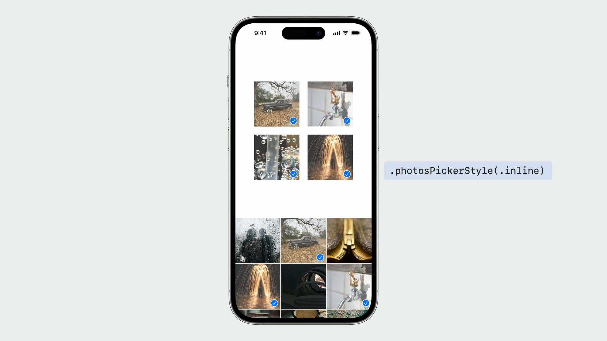 - App 启动即显示全屏照片选择器界面,而不用通过 .sheet 窗口拉起。——这是通过设置为 .inline 模式实现。