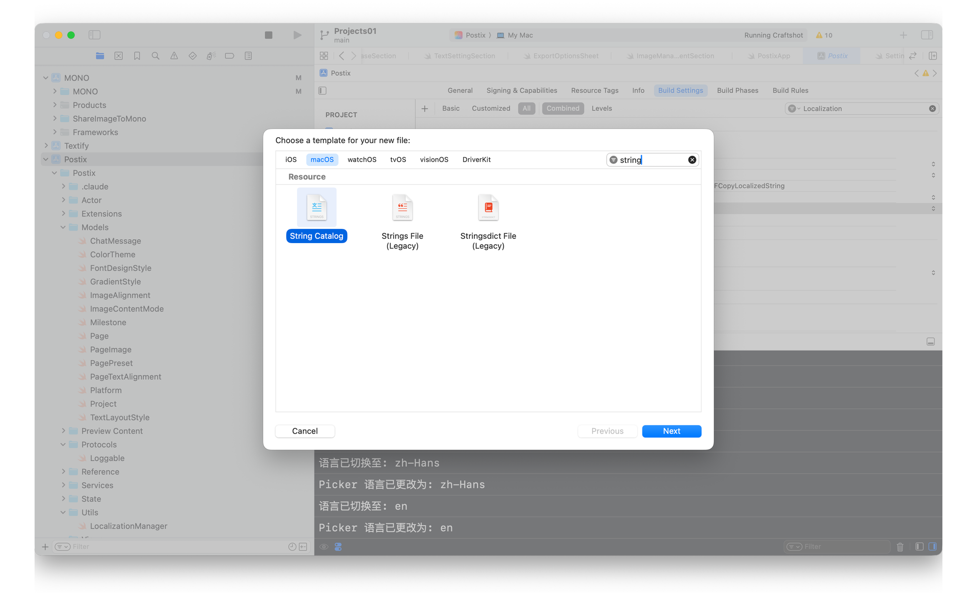 Localizable.xcstrings 就是一个集中管理所有语言版本的文件,以便系统能够正确调用。File → New → File from Template,选择 String Catalog,命名为 Localizable.xcstrings。