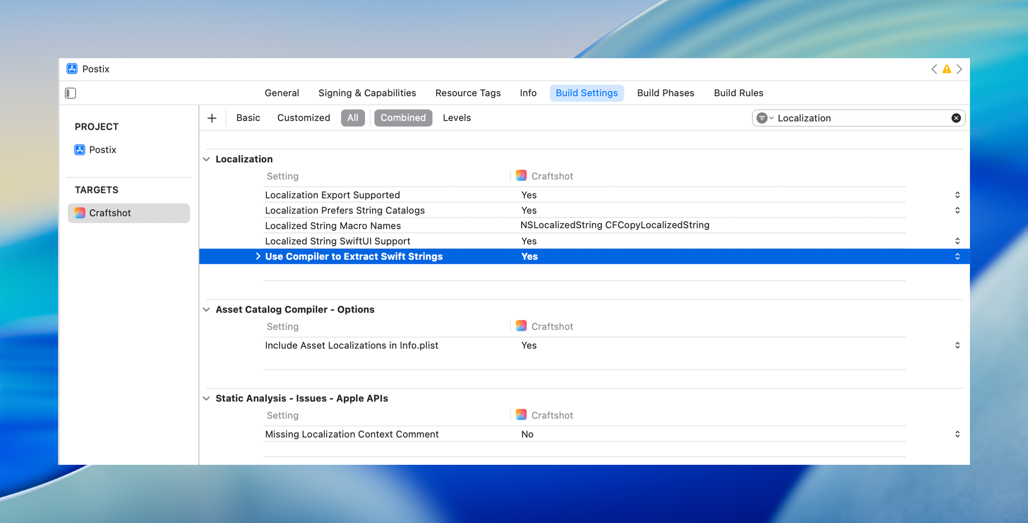 "Use Compiler to Extract Swift Strings" 的具体作用是让编译器在构建时自动扫描和提取代码中的可本地化字符串。
