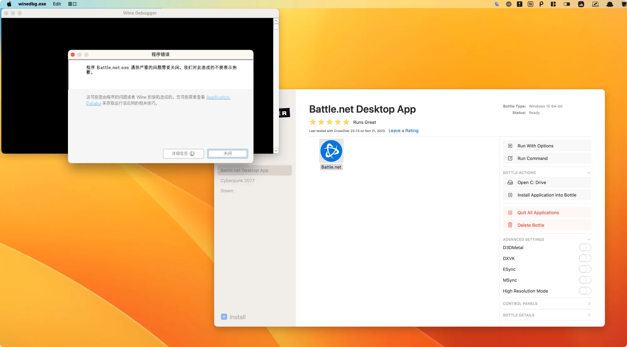 战网客户端(国际版)在 2023 年 12 月 1 日发布了一版更新,自此更新之后, Mac 用户在使用 CrossOver 启动战网客户端时,会遇到以下错误,并且持续性的崩溃提示: