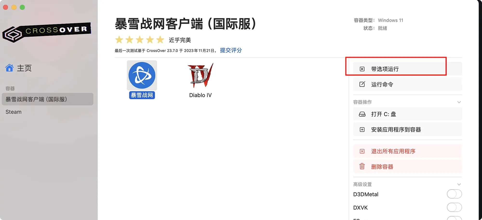 步骤一: 选中暴雪战网客户端,然后点击右侧「带选项运行」:
